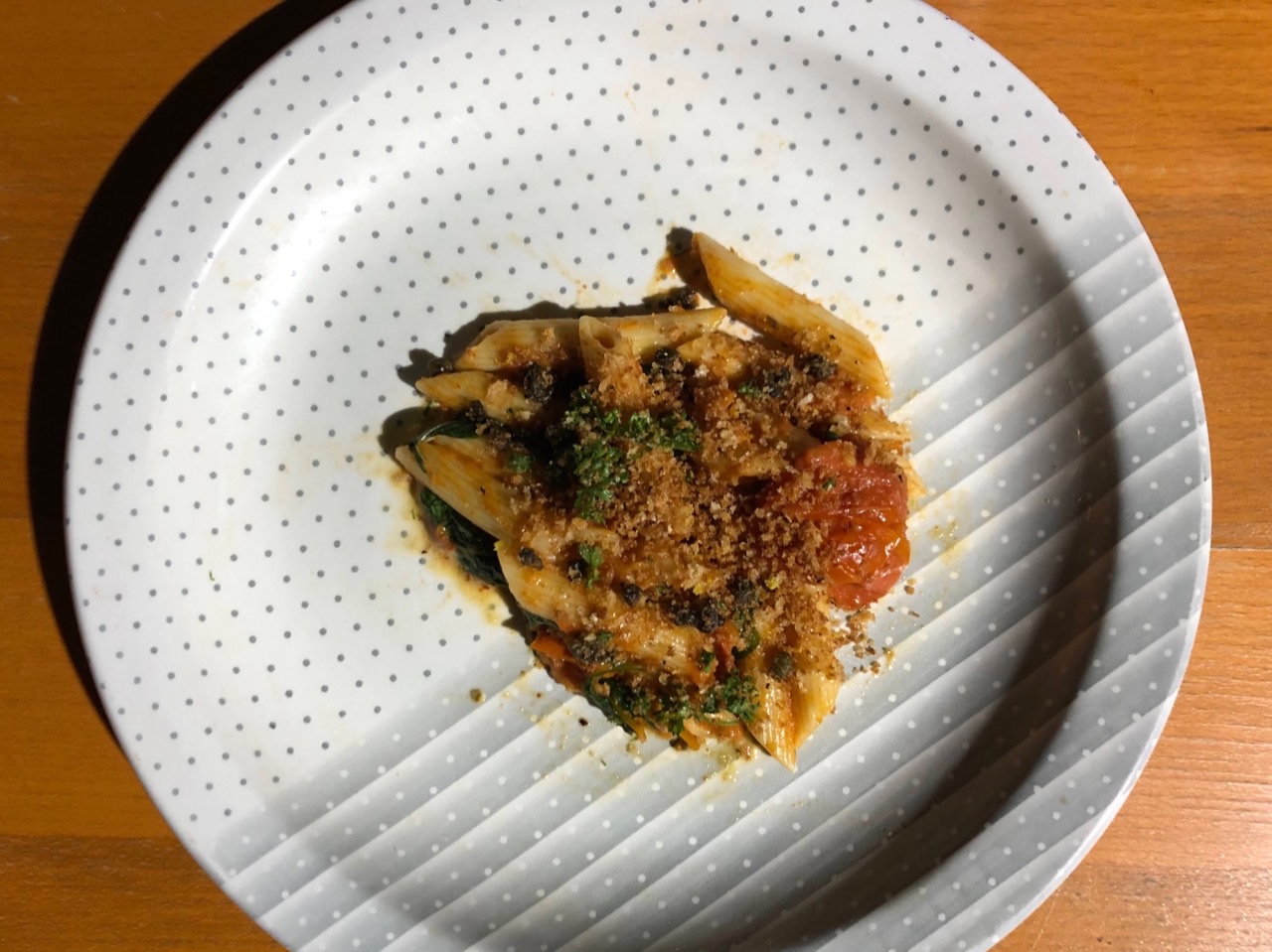 I made Pasta with Burst Cherry Tomato Sauce and Fried Caper Crumbs. I will definitely be making this again. The pasta with tomato sauce was already delicious, but then adding the fried caper and panko crunchies just put it over the top. Basil, parsley, and lemon gave it just the right amount of freshness, too.