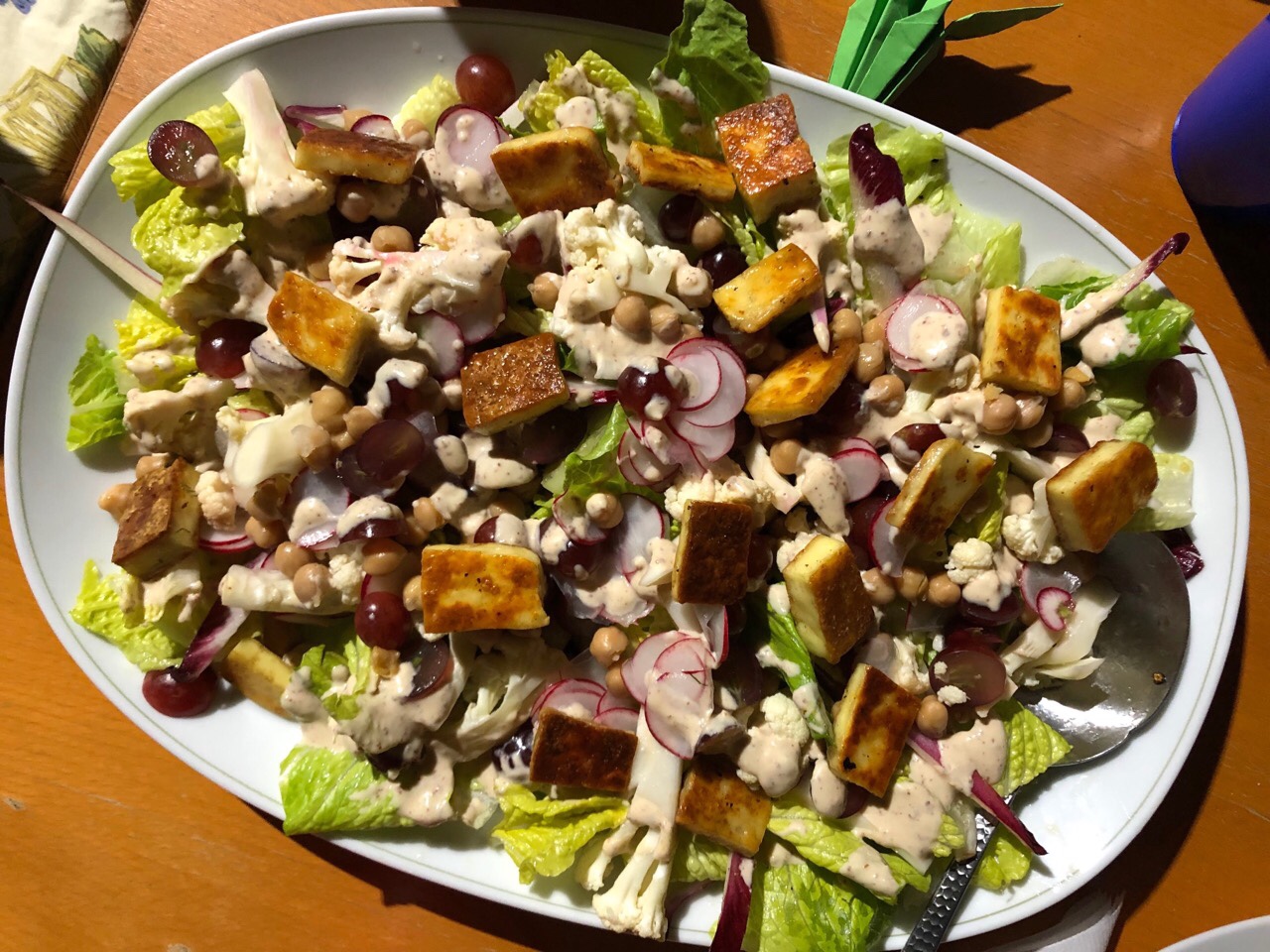 Brian made Hearty Green Salad with Chickpeas, Pickled Cauliflower, and Seared Halloumi. I loved this salad. The crunch of the greens, cauliflower, and radish, the sweetness of the grapes, the creamy dressing, the heartiness of the fried halloumi (which I can never get enough of) – all came together to make a salad I’d happily eat as a meal all by itself.