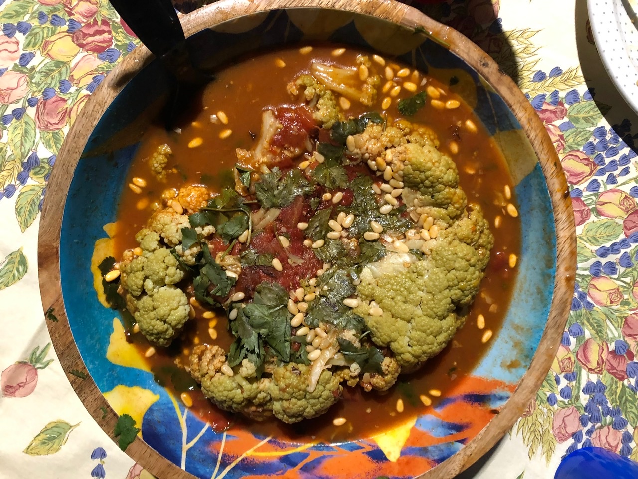 Barbara made Pressure-Cooker Braised Whole Cauliflower with Olives, Raisins, and Pine Nuts. The flavors were great, though the cauliflower became quite mushy despite only being pressure-cooked for 3 minutes. The cauliflower head didn’t stay whole for the fantastic presentation it was supposed to provide, but I loved the green cauliflower Barbara chose to use.
