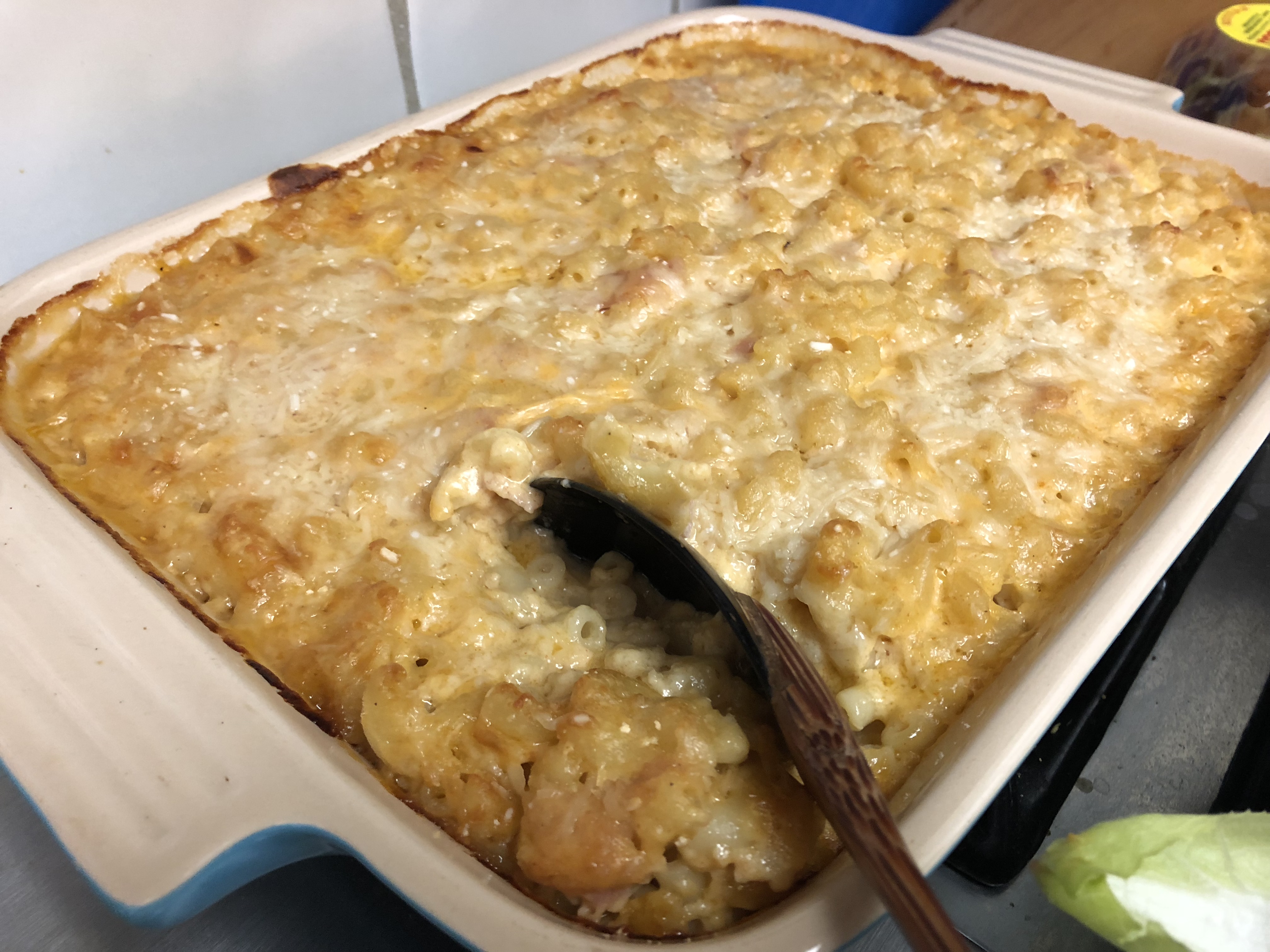 Laura also made Macaroni and Cheese. Pasta baked with lots of cheese and butter is never bad. This wasn’t a particularly mind-blowing mac and cheese and it needed some salt, but for a basic home-made version of this dish it did the trick.