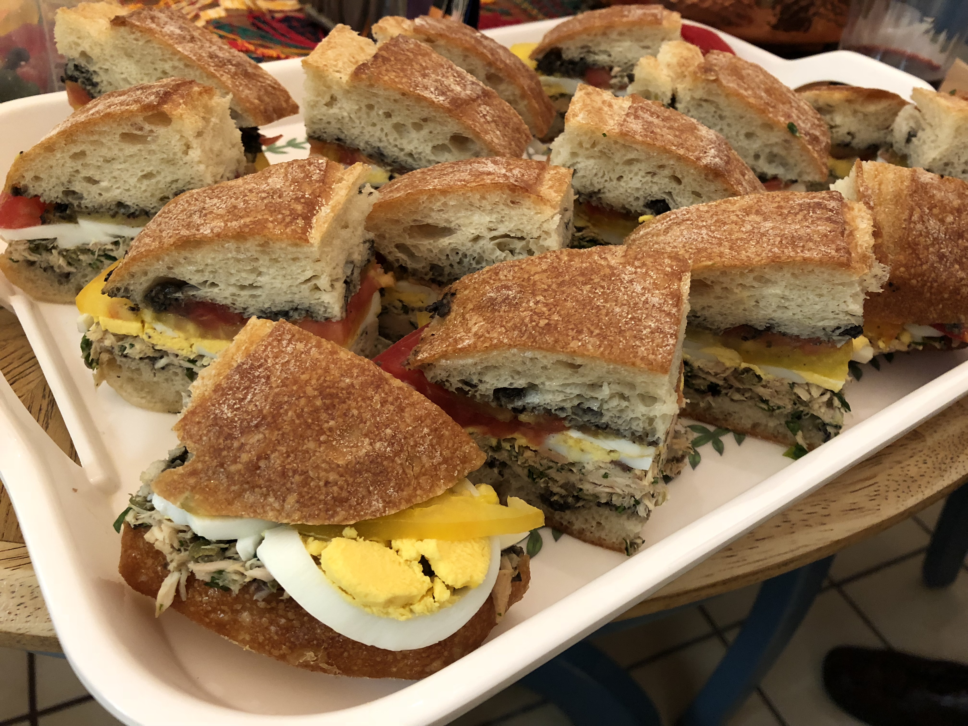 Alyssa made Pan Bagnat. These are sandwiches with a tuna/anchovy/caper mixture, olive tapenade, hard-boiled eggs, and tomatoes. Fancy tuna sandwiches – yum! Anthony Bourdain noted in the recipe that they’re great to bring to the beach or on a picnic, and I’d agree.