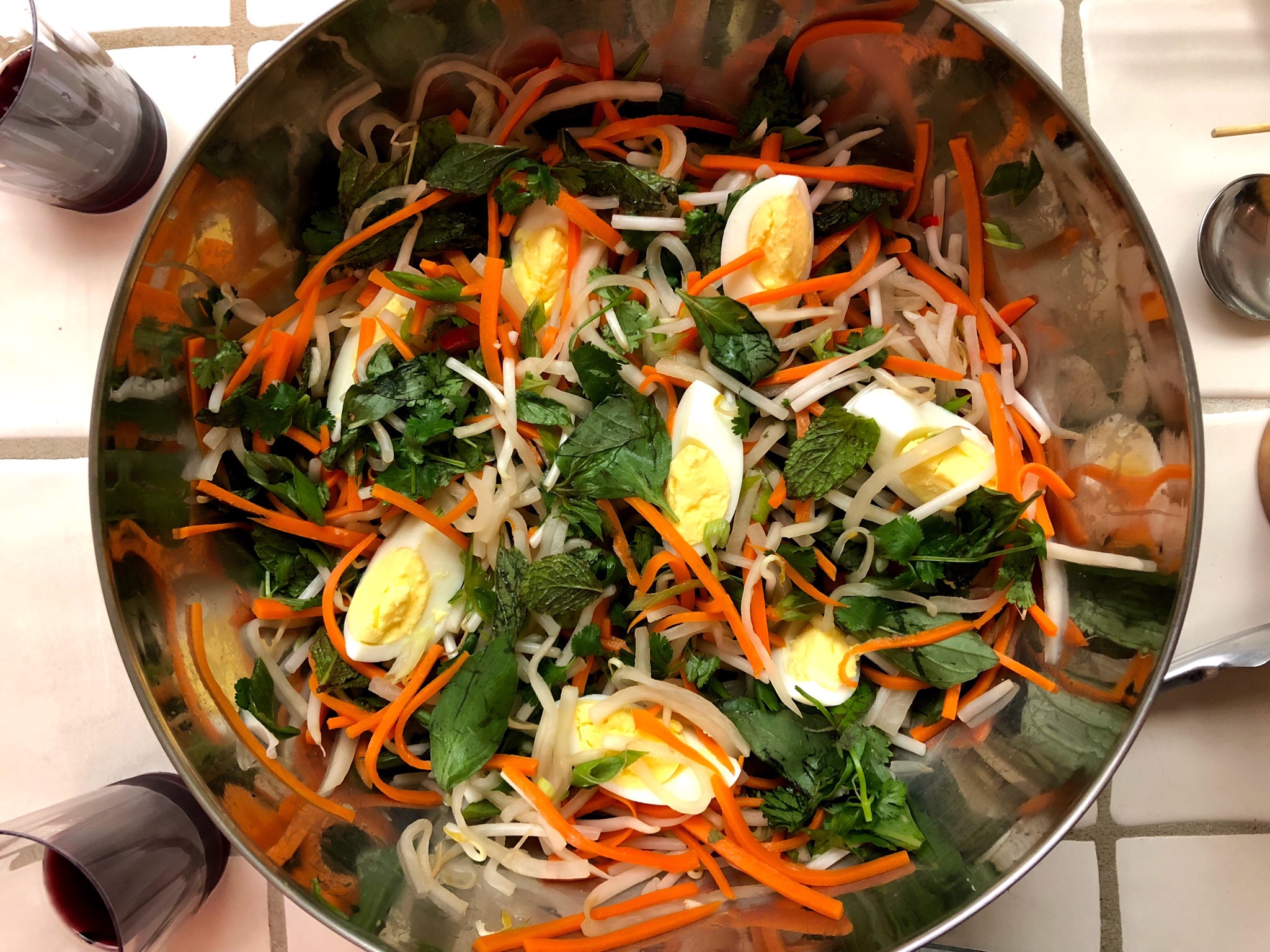 I made Do Chua Salad with Herbs, Scallions, Sprouts, and Egg. I really liked this dish. It had great crunch and strong flavors from the herbs and the funk of the Nuoc Mam Cham dressing (a Vietnamese dipping sauce of lime juice, sugar, fish sauce, Thai chili, and garlic). The daikon and carrots were a big pain to prep as they had to be julienned, then sit in sugar and salt for 30 minutes, then squeezed, then brined in sugar and vinegar for an hour. But even with all the effort involved, I’d make it again.