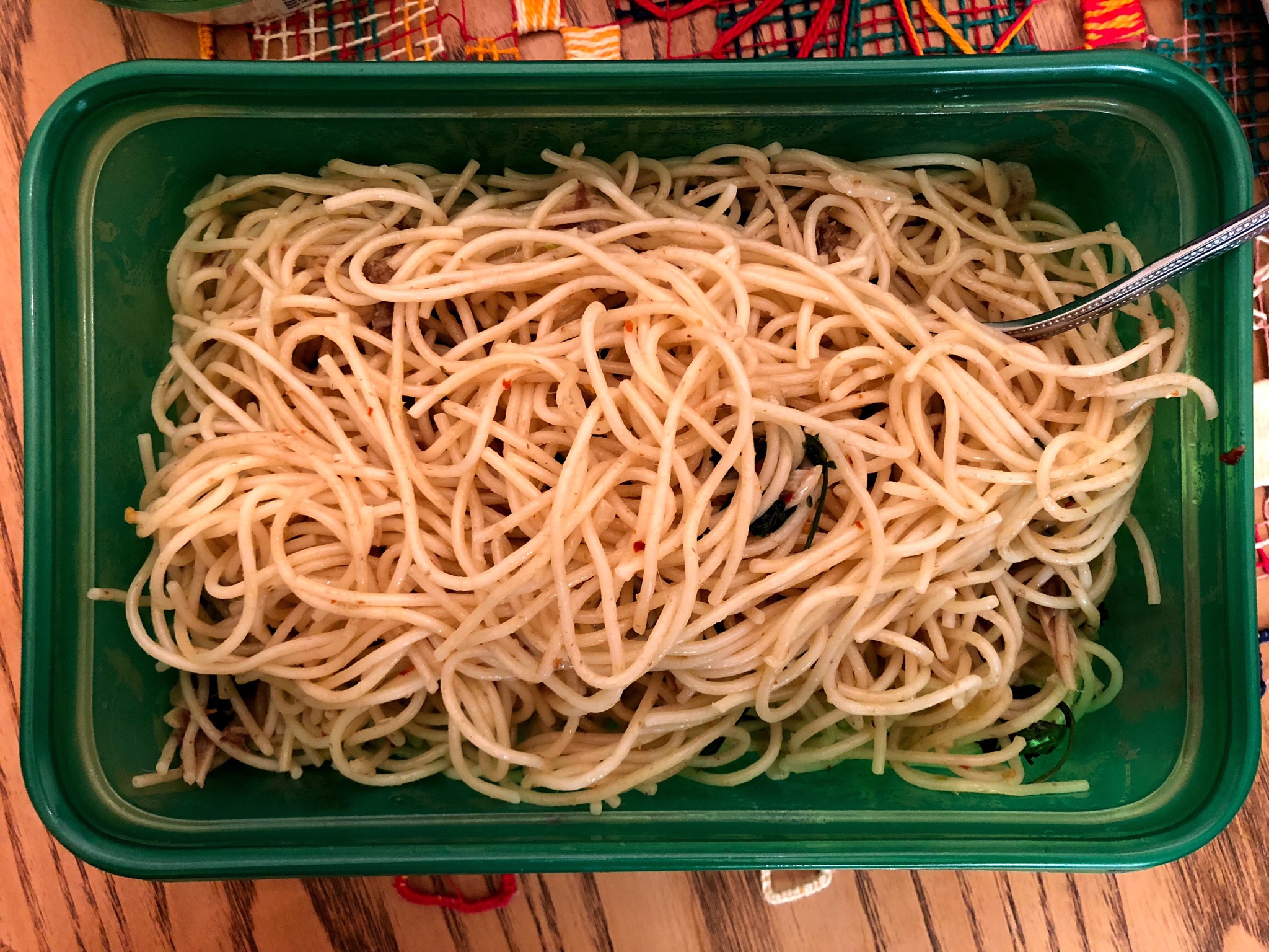 Kamy made Spaghetti with Garlic, Anchovies, and Parsley. This is a super simple but super yummy pasta. The anchovies melt into the oil so you don’t see that they are there, but they give the spaghetti wonderful flavor along with the garlic. Not much to look at, but I could eat bowls and bowls of this.