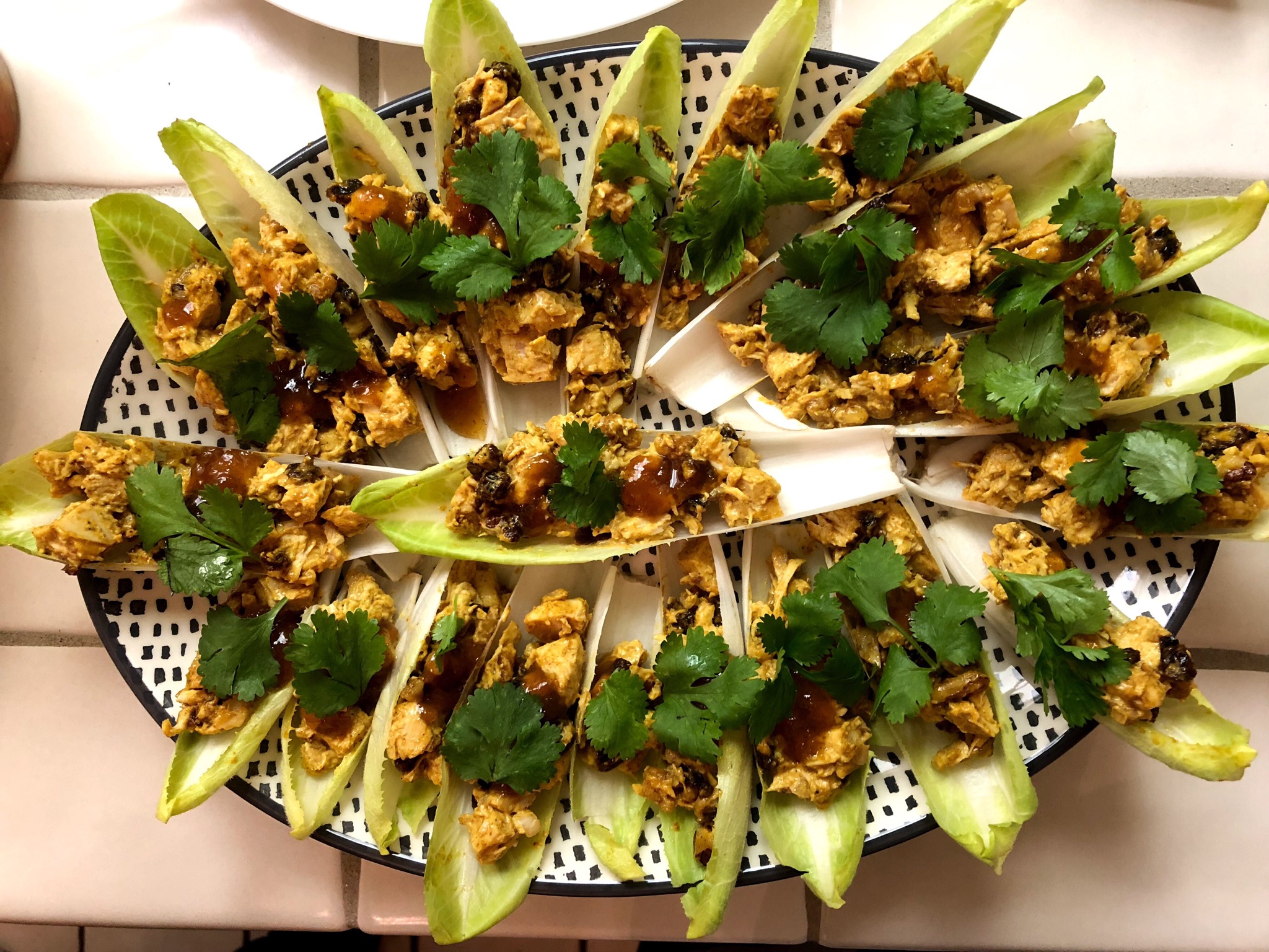 Michael also made Belgian Endive with Curried Chicken Salad. The presentation was gorgeous, though as I watched Michael toil over the assembly it made him mutter “I hate endives”. It seemed that putting the dish together was the hardest part. These were tasty treats, with nice crunch from the endive boats and a bit of sweetness from the chutney dabbed on top.