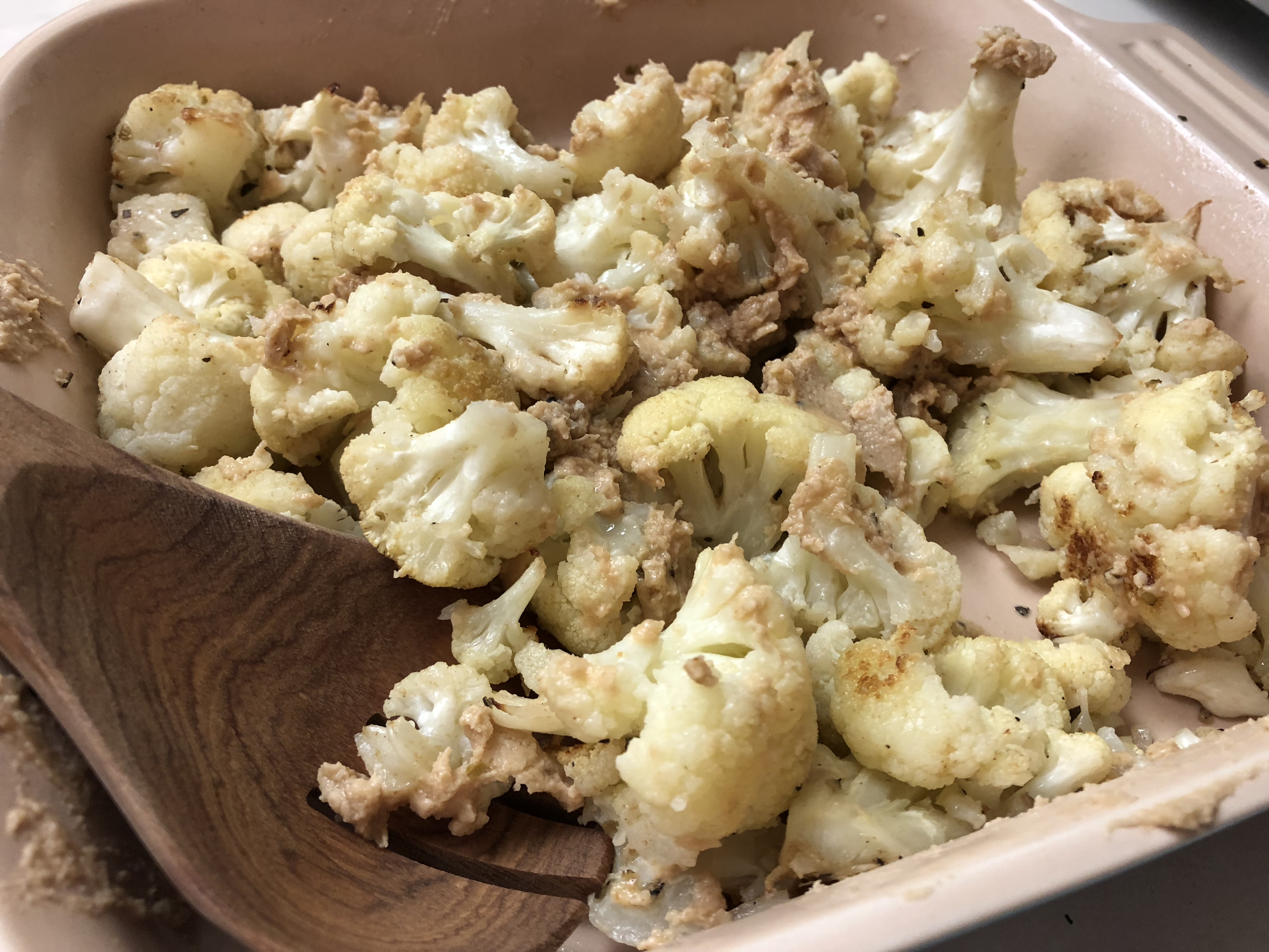 Laura made Roasted Cauliflower with Sesame. Her oven was occupied, so she did the cauliflower in the toaster which I think unfortunately resulted in it being more steamed than roasted. The sesame sauce turned out way too thick to be able to whisk until smooth, so she had to add more water and eventually just tossed the hot cauliflower with the chunky sauce with hopes that it would melt, which for the most party it did. It wasn’t a particularly stand-out dish for me.