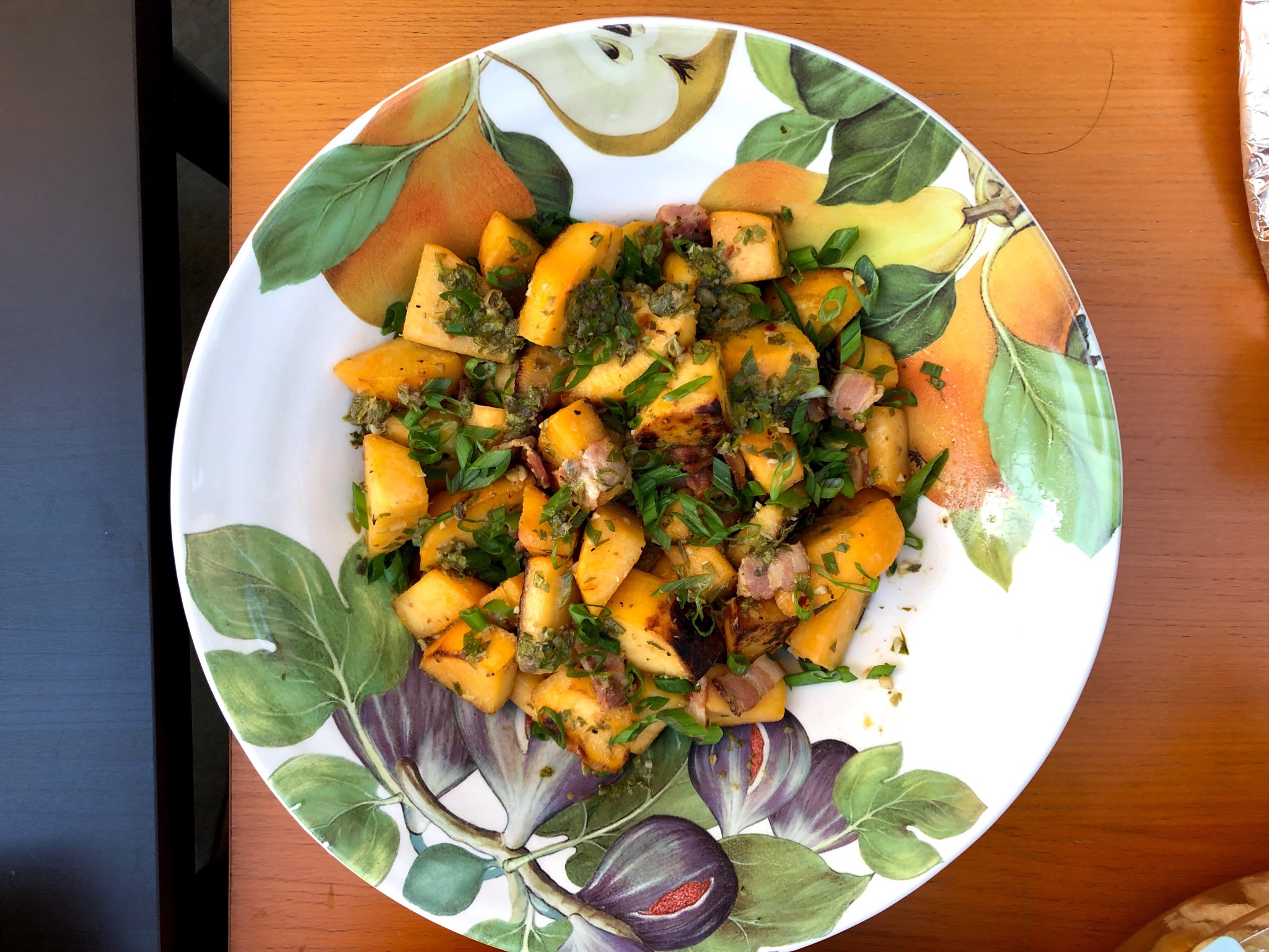 Domenica made Rutabaga and Pancetta with Lemon, Anchovy, and Capers. She used regular anchovies instead of white ones, and black pepper bacon instead of pancetta. As far as I could tell, these substitutions worked out just fine. I don’t recall ever eating rutabaga as the primary ingredient in a dish before, but I’m definitely going to be looking for more rutabaga recipes now.