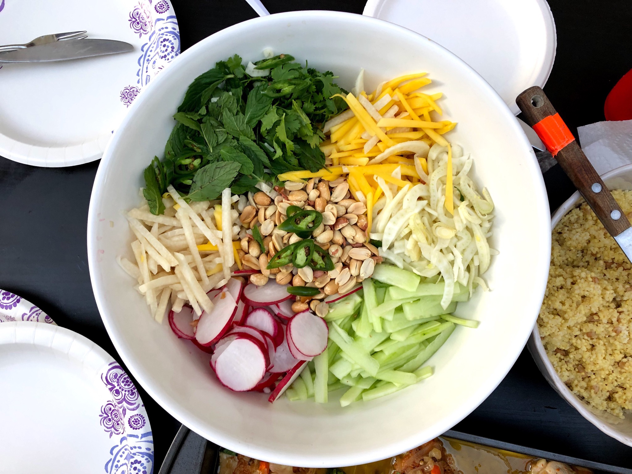 Cindy made Jicama Salad with Mango, Fennel, Cucumber, Peanuts, and Lime and Fish Sauce Vinaigrette. I loved all of the different textures, and how all of the ingredients were substantial enough to hold up while soaking in the funky, tangy, spice of the vinaigrette. A wonderfully refreshing salad perfect for a summer night.