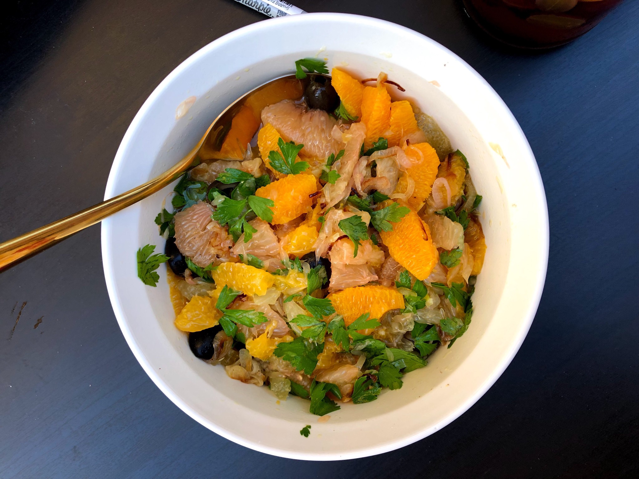 Jennifer made Citrus and Dry-Cured Olive Salad. She accidentally bought some sort of hybrid oranges that were very sweet. We agreed it would have been interesting to have the dish with tangier oranges, as with the sweeter oranges it seemed a bit flat. I was also surprised the olives didn’t add more brininess.