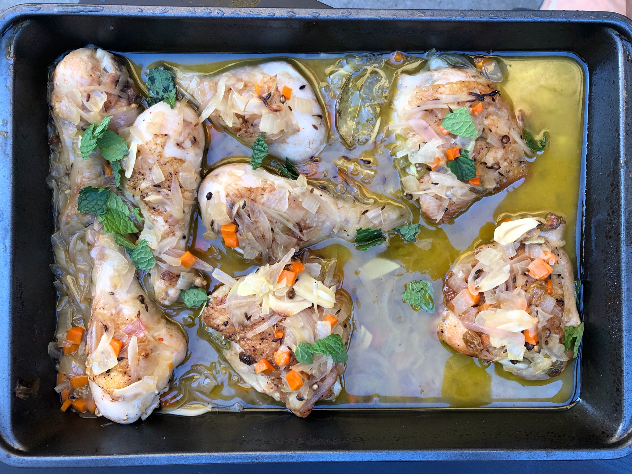 Jeff made Chicken Escabeche with Mint. Pan-roasted in vinegar and spices, the chicken was juicy and nicely absorbed the flavors of the marinade. And oh man was that a tasty marinade… my favorite part of the meal was actually using some of the leftover pita from Shayna’s dish to soak up this chicken’s pan juices and then pile on some of its onions and raisins. So good!