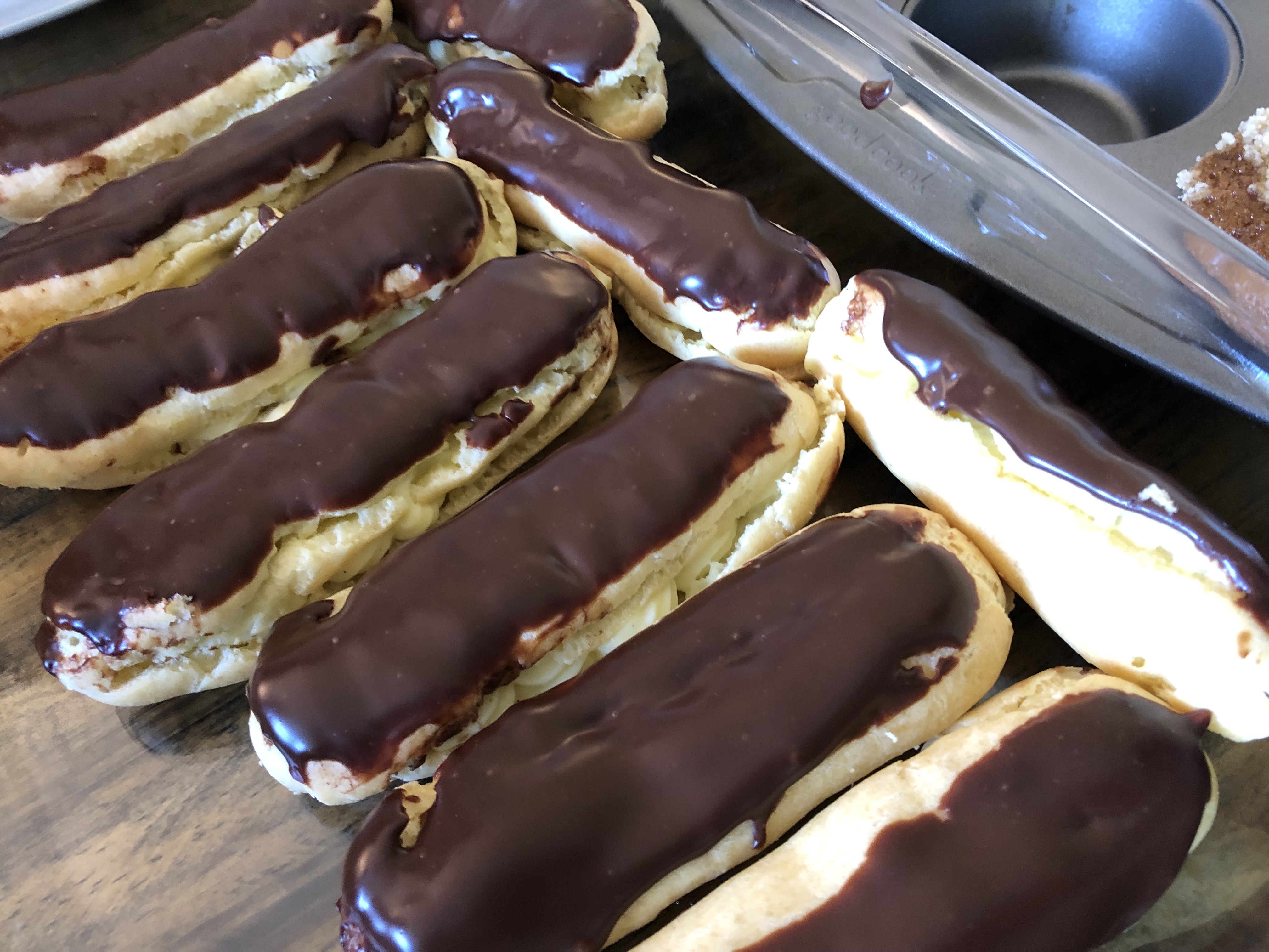 John made Eclairs. Strangely the recipe for the eclair pastry shells doesn’t point you to the filling recipe, so he had to search it out and then find his own chocolate glaze recipe. But it all came together to make some tasty eclairs.