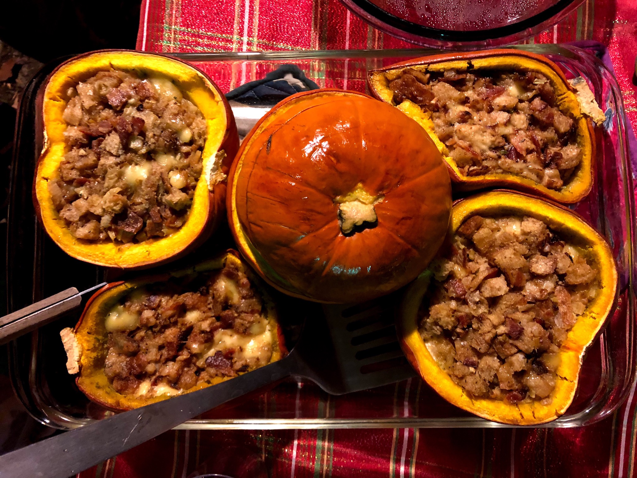 Brian made Pumpkin Stuffed with Everything Good. “Everything Good” in this context is bread, cheese, garlic, bacon, and cream… which I would generally tend to agree with. Again however, with so much soft, cheesy, creamy food around, I wasn’t as happy eating this as I think I should have been. It did have a fun aesthetic that was very inviting.