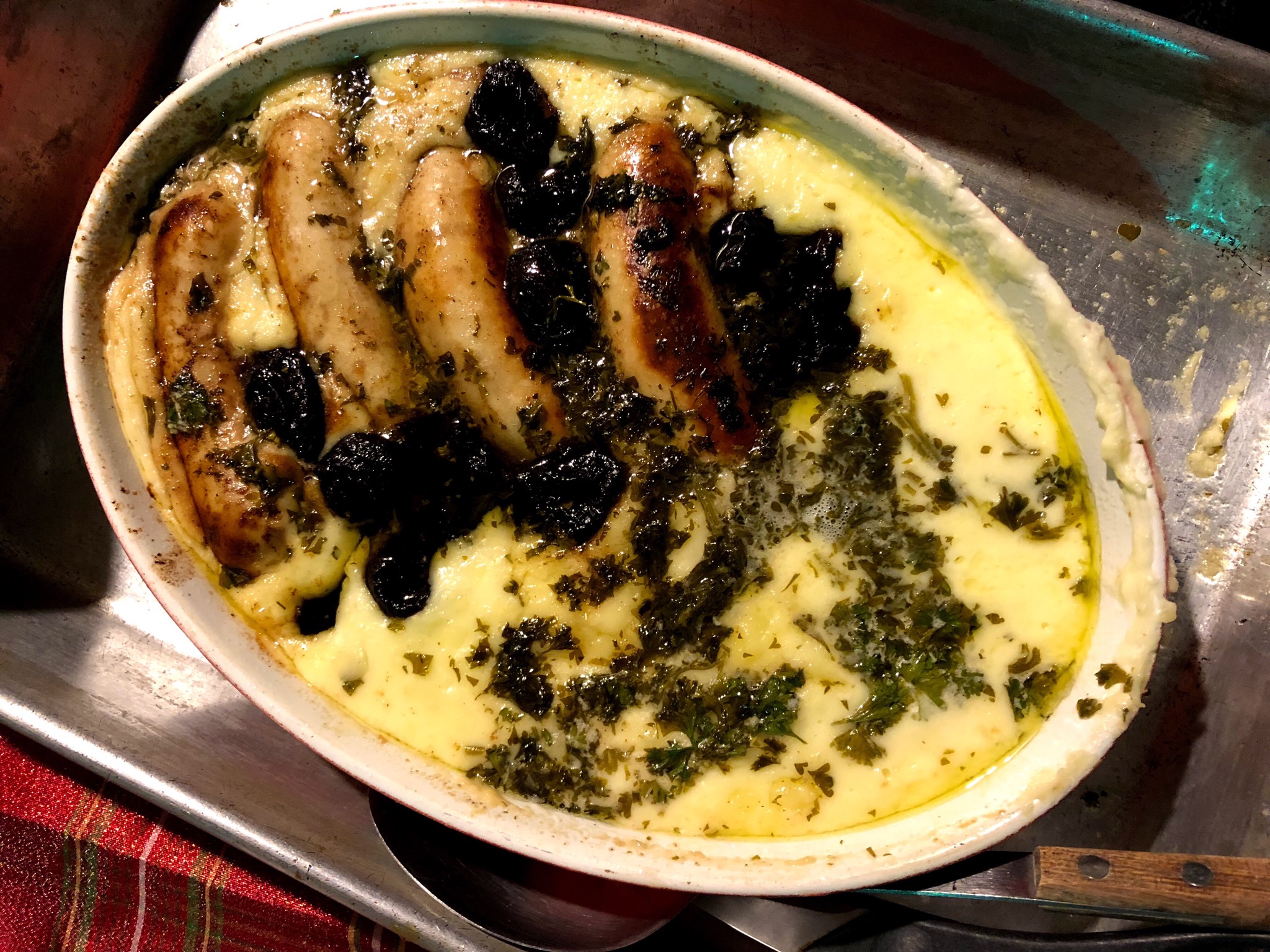 Erin made White Sausage with Prunes and Potato Puree. Another soft, creamy dish. I knew I wasn’t going to be raving over the pureed potato, but I had high hopes for the flavor pop that the spiced prunes would add to the complexity of this dish. The prune flavor turned out to be more subtle than I was hoping for, and white sausage tends to be a soft sausage so I found myself wanting some chew or crunch to sink my teeth into.
