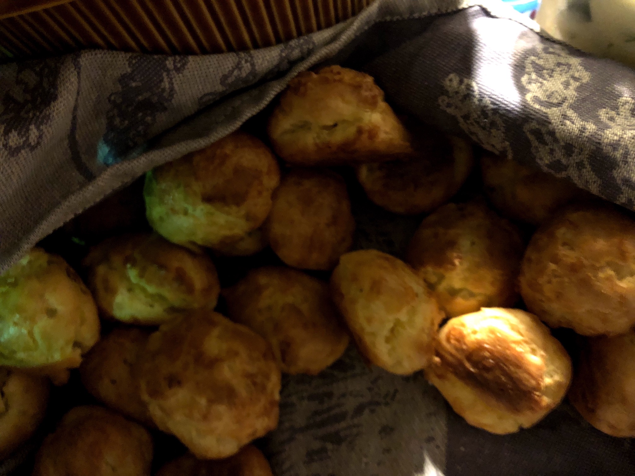 Suzy made Gougeres. And I am so glad she did. Dorie Greenspan describes gougeres as cheese puffs. But don’t be confused with thoughts of those neon orange, styrofoam-resembling Cheetos products… these are wondrous balls of dough that when baked puff up into airy, cheesy bites of goodness. I could have stood there popping these treats into my mouth until the whole basket was empty.
