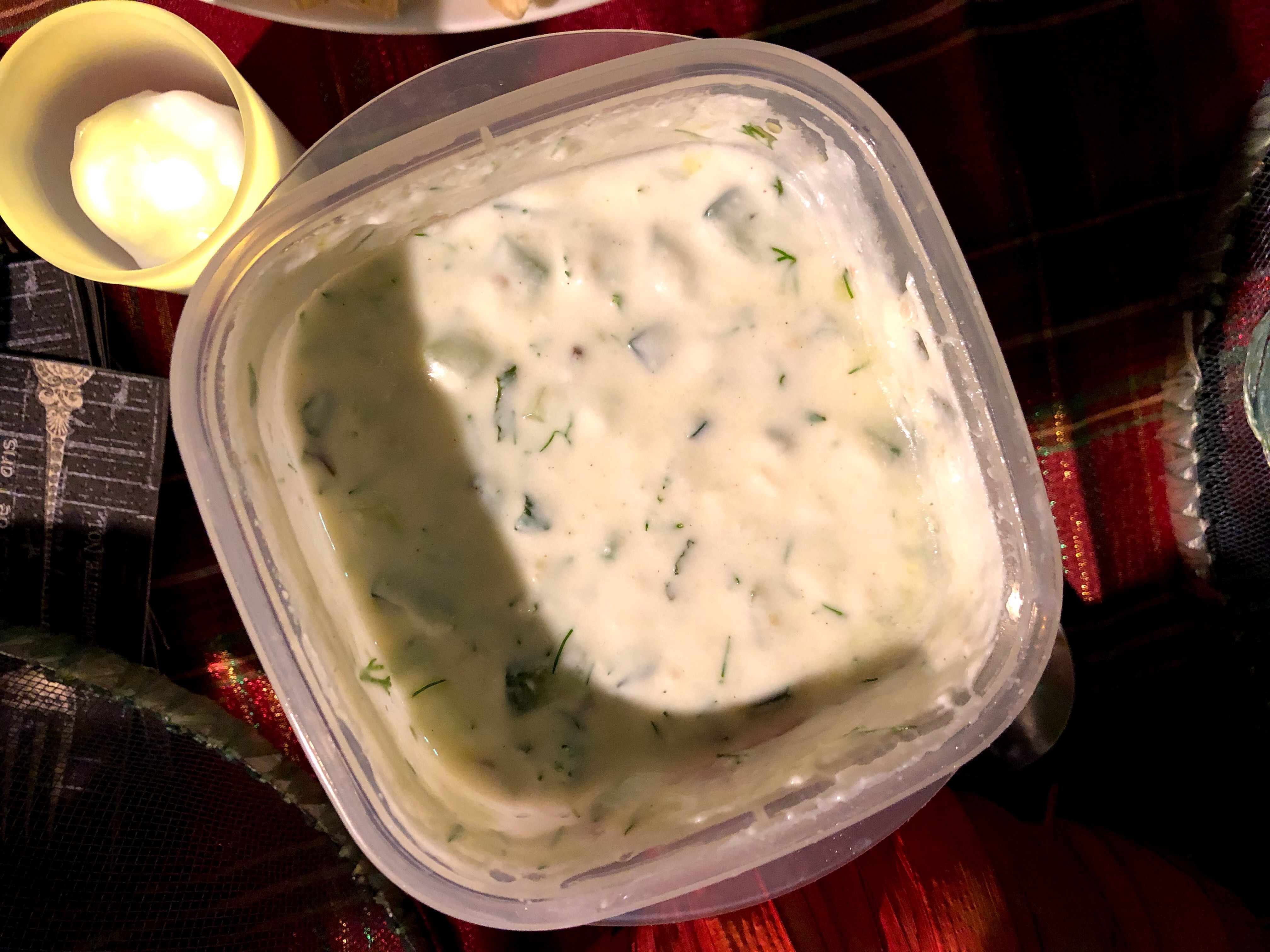 Riley made Tzatziki. It is a traditionally Greek and Middle Eastern yogurt and cucumber dip, and I struggled to find something among all the French food to eat it with. I stole an endive and a chip from the other dishes to scoop some of the tzatziki up. It tasted much like other tzatzikis I’ve had before.