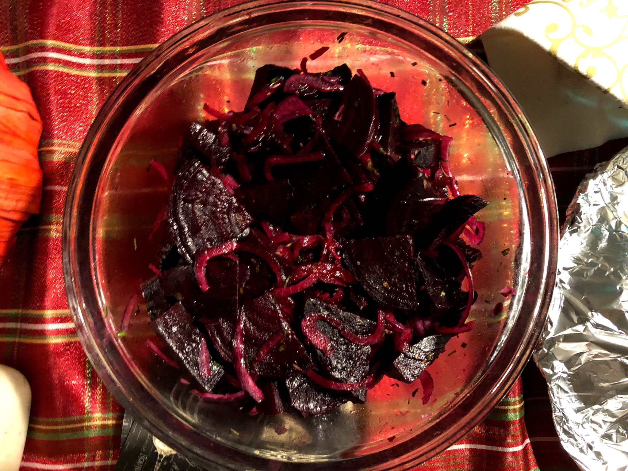 Jenny made Roasted Beet Salad. I like roasted beets and I enjoyed this salad, but again there was nothing to make this beet salad stand out from many others I’ve eaten. Though I’m always happy to eat beets that someone else wants to make, to save me the hours and mess of roasting them myself.