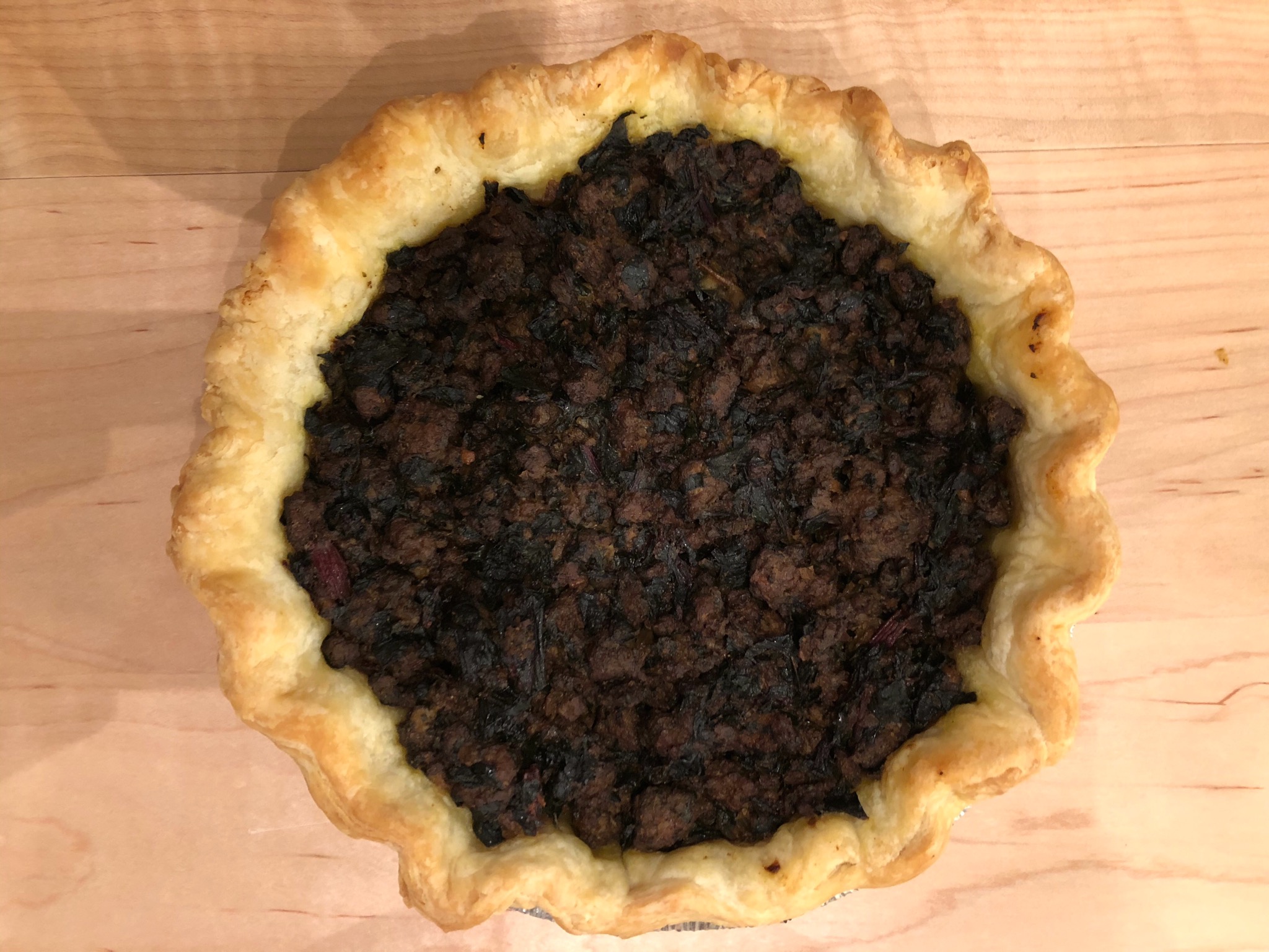 Amy made Kefta and Swiss Chard Quiche + Goat Cheese and Harissa Sauce. There weren’t any eggs in this, so more of a meat pie than a quiche, but whatever you call it I call it delicious. The beef and chard filling was good on its own, and even better with with some of the creamy, slightly spicy sauce.