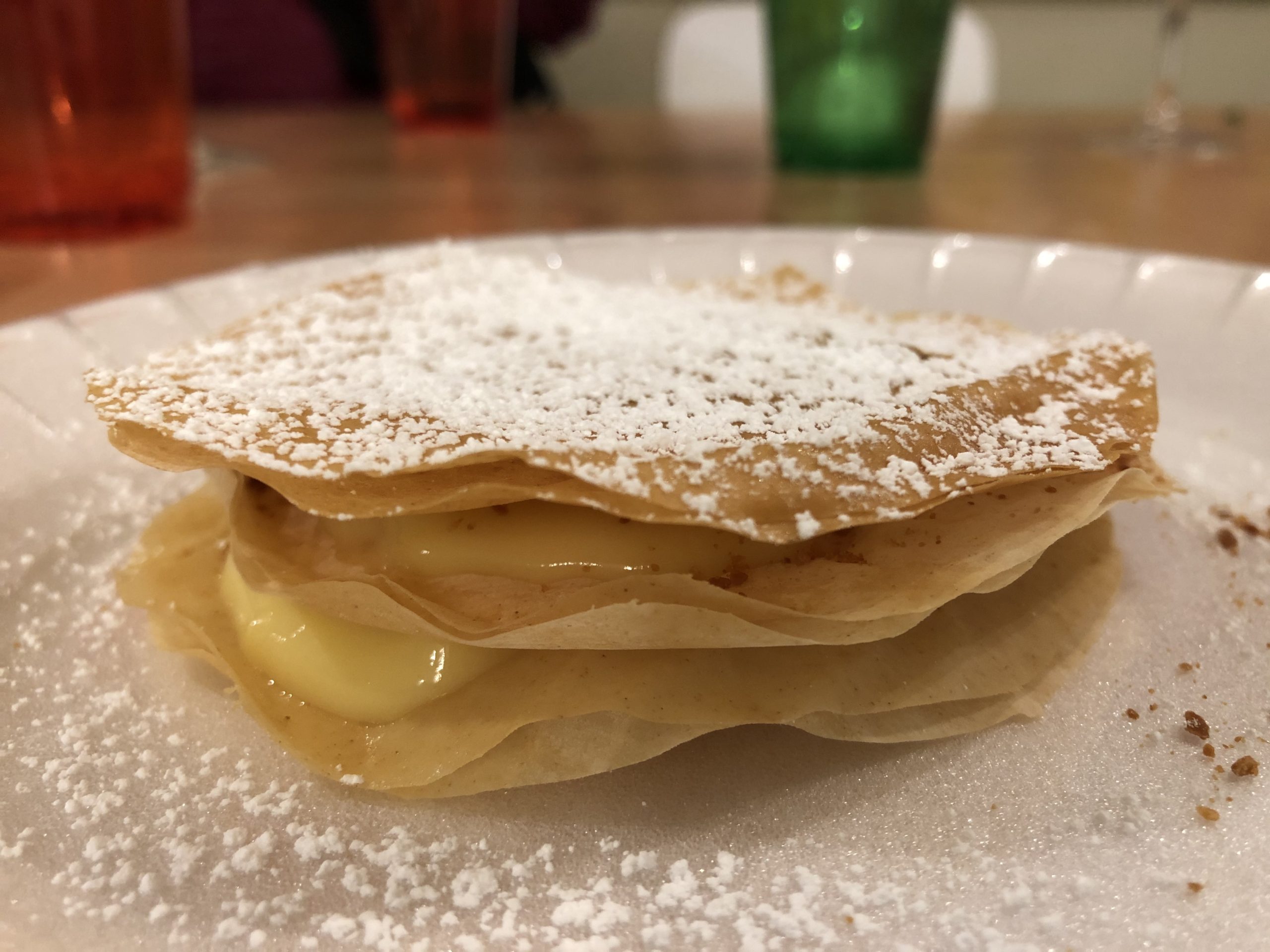 Jeff made Ktefa – Milk Bastila. This is alternating layers of filo pastry, pastry cream, and crushed roasted almonds. It looked lovely and tasted just as sophisticated – a perfect combo of crisp pastry, yummy cream, and nutty topping. I ate three of them!