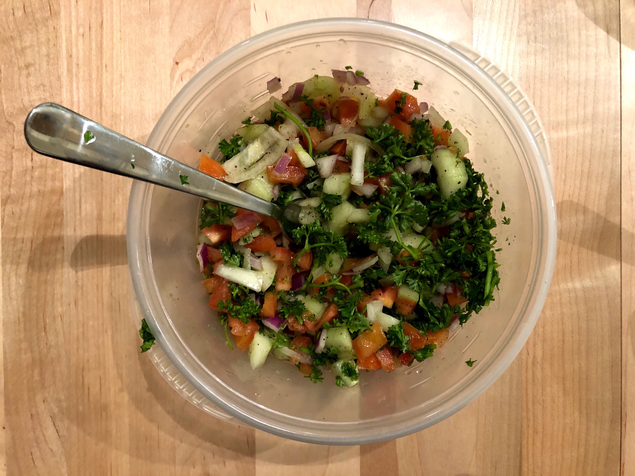 Kamy made Moroccan Tomato and Cucumber Salad. This was a really basic mixture of tomato, cucumber, and onion seasoned with olive oil, parsley, lemon juice, salt, and pepper. I wanted something to give it a bit more zing.