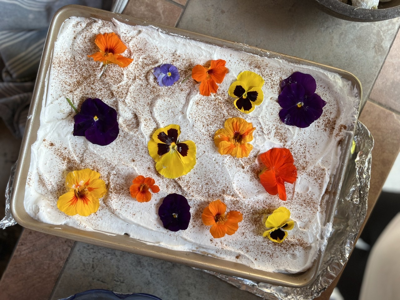 Ingrid made Tres Leches Cake. This was a bonus recipe not from the cookbook, but we’ll never complain about extra dessert. And what a gorgeous presentation with edible flowers as topping!