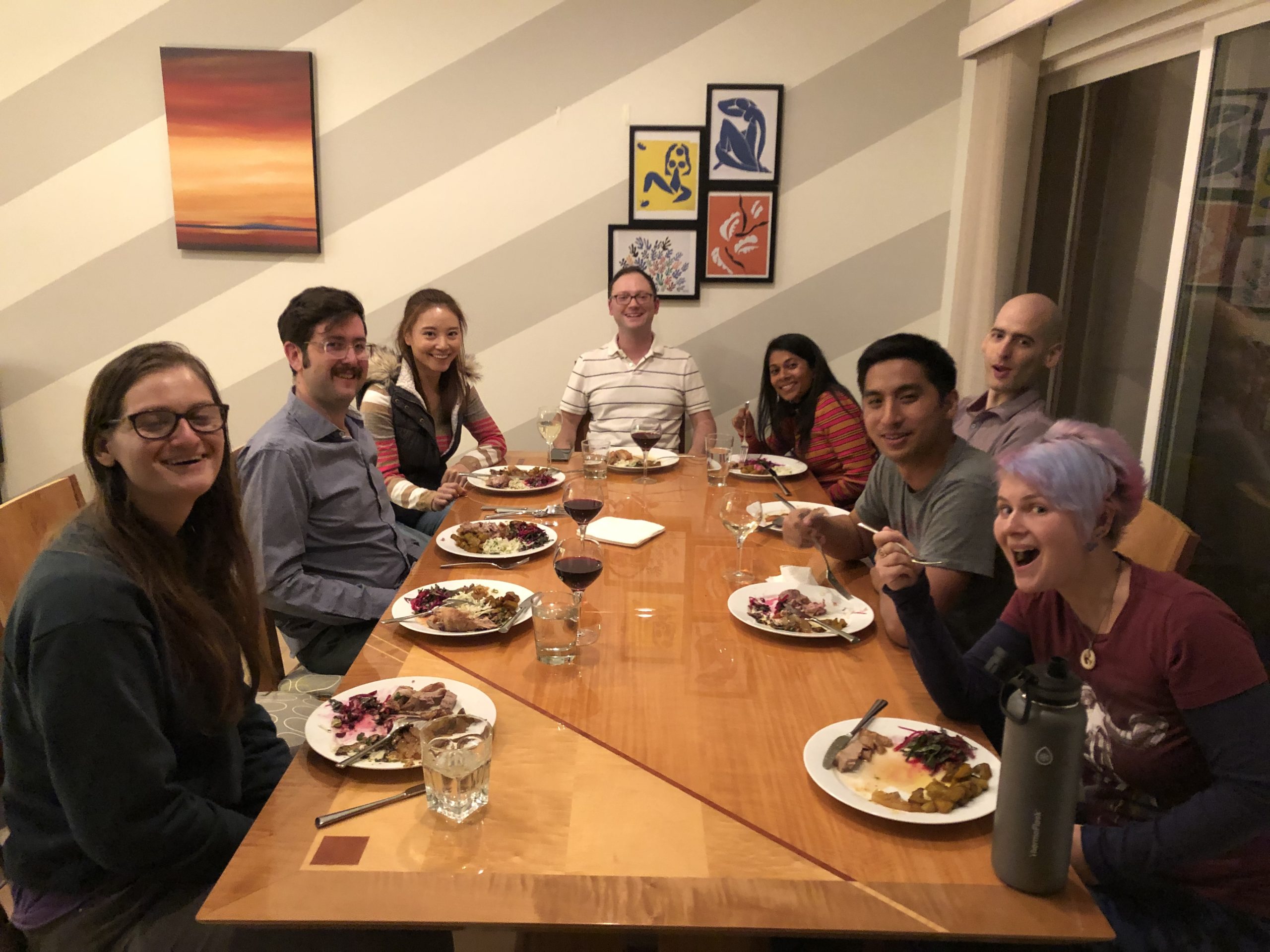 In what has now I think become our Thanksgiving tradition, we skip the cookbook and instead use our November cookbook club event to celebrate Friendsgiving. Each person brings a dish they have been wanting to test out, or one that is their Thanksgiving specialty. I am especially thankful for the truly wonderful things that Cookbook Club has brought to my life – tons of great food and more lasting friendships than I could have imagined. Friendsgiving party John hosted us at his nice big table, which allowed all 10 of us to sit together and share the meal and conversation. Special thanks to him for also allowing Cindy, Kris, Drew, and me to strong-arm him into roasting duck instead of turkey, which heโ€™d never done before but came out fantastic! And in true Thanksgiving fashion, we had 6 desserts ๐Ÿ™‚ Definitely my kind of feast…
