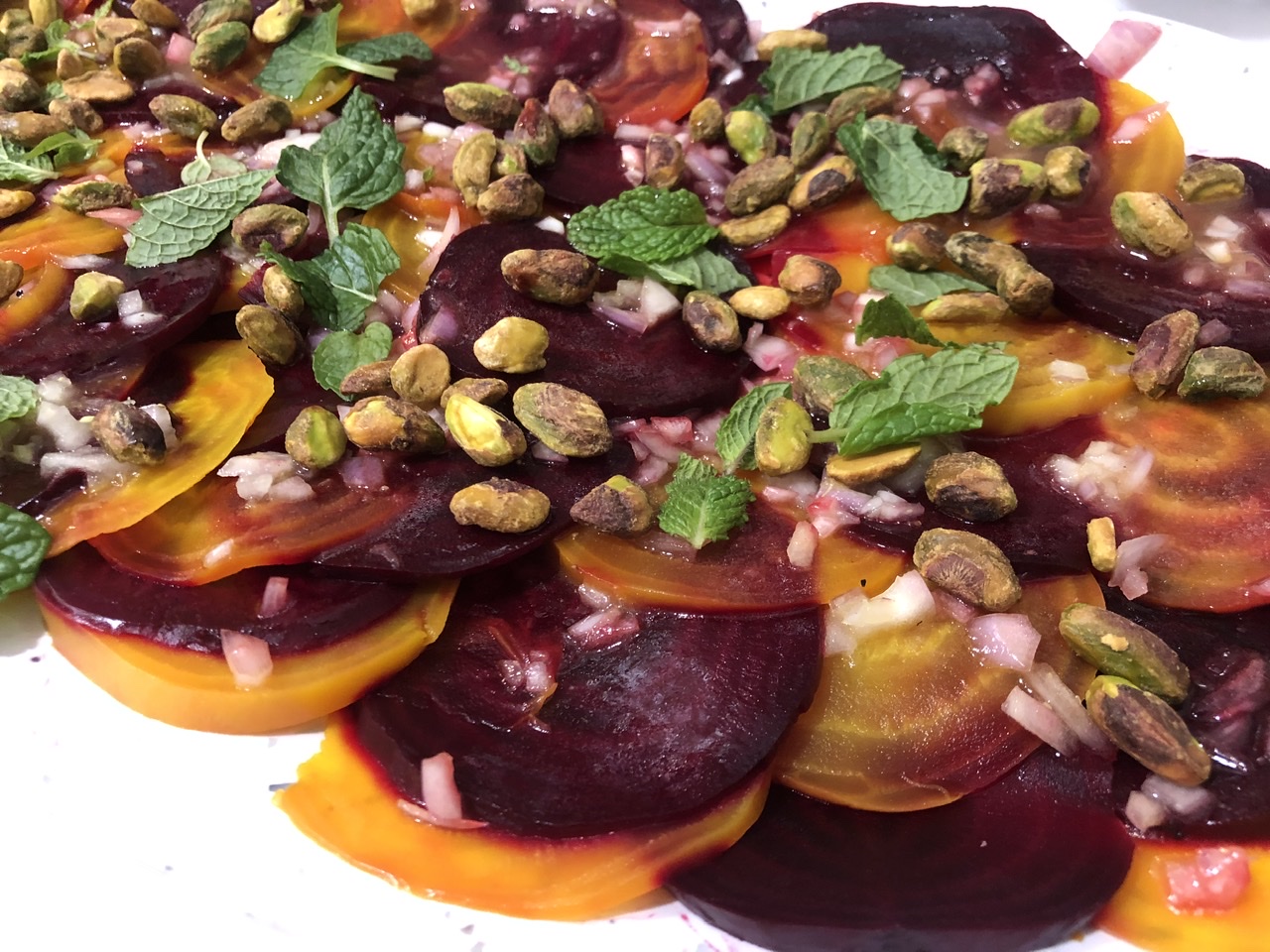 Brad made Roasted Beet Tartare with Cheese and Pistachios. As you can see, this dish couldn’t be more beautiful. And it had the taste to match. So many wonderful layers of flavor between the beets, orange vinaigrette, shallot, pistachios, mint, and creamy cheese.