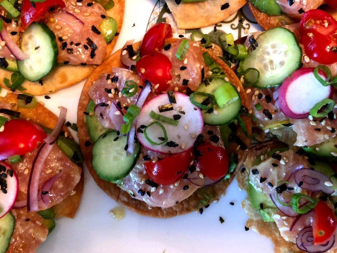 Anthony made Chicken Adobo Tacos. Avila got the adobo recipe from Margarita Manzke, another L.A.-based chef whose Filipino food I adore. Anthony didn’t make the recipe-recommended Avocado-Tomatillo Salsa, but he provided a bonus cucumber-tomato relish that added a nice freshness to the adobo. These scrumptious tacos were a party favorite.