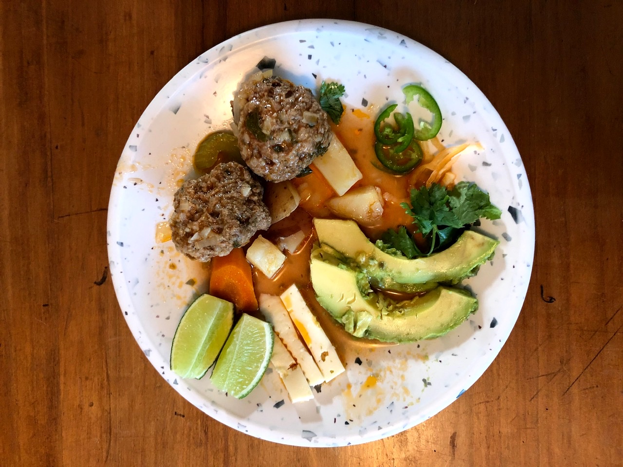 Amy made Albondigas. She thought about just bringing the meatballs without the broth for ease of transportation, but we were glad she brought the broth as well because it was delish. There were a ton of garnishes – lime, cheese, avocado, serrano and habanero chiles, and cilantro – which made for labor-intensive plating, but having a bite with a little bit of everything made it well worth it.