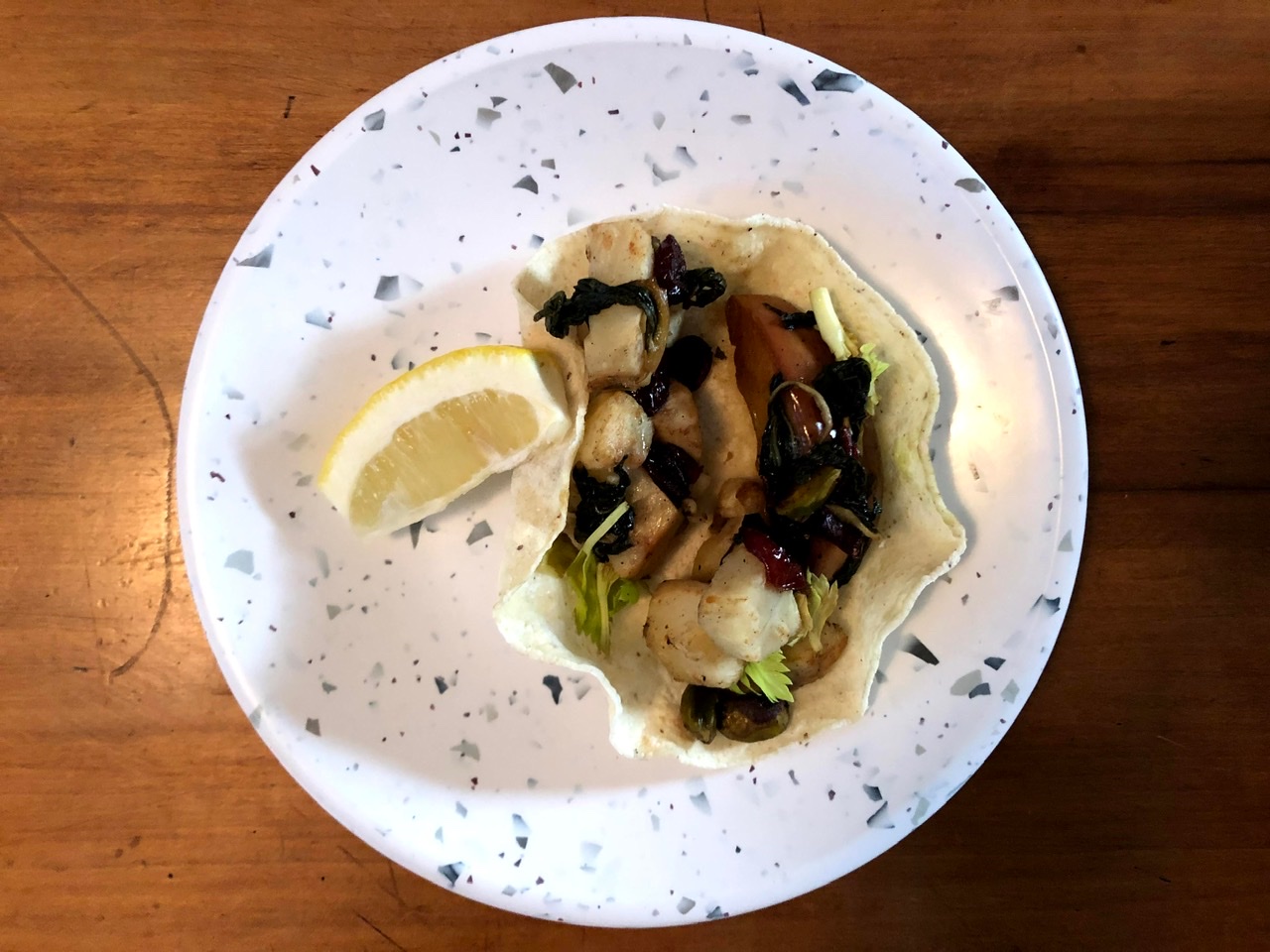 Austin made Celery Root Tacos. On top of the celery root was an apple-cranberry-swiss chard mixture which gave these tacos a sweetness I wasn’t expecting but didn’t mind, especially when offset with the Burnt Tomato Salsa.