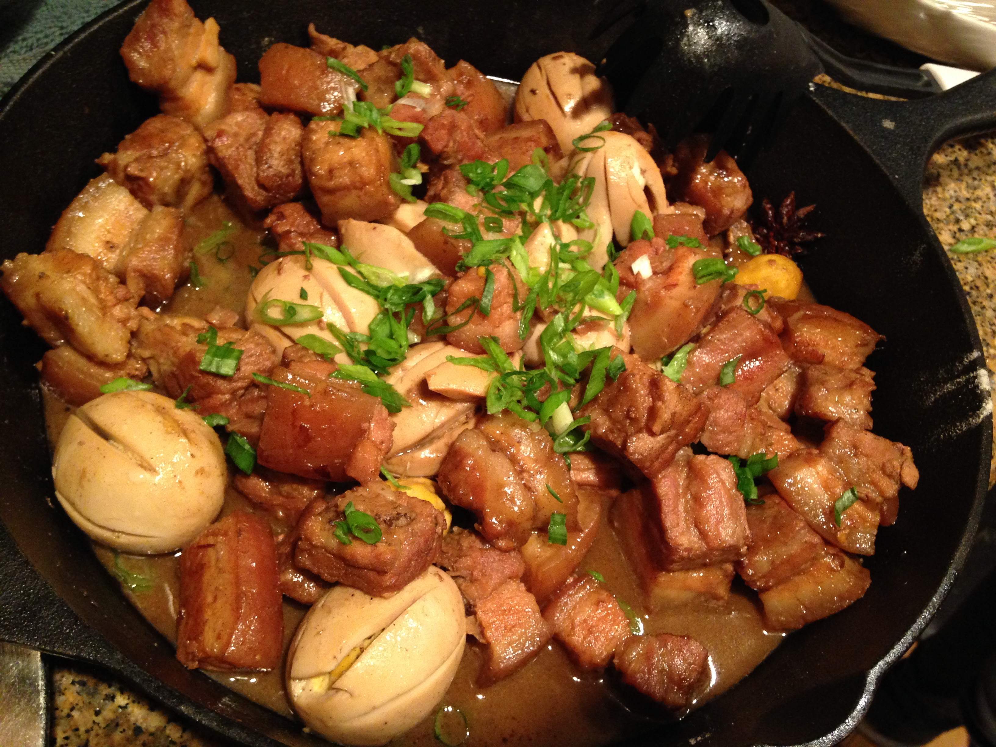 Colin made Shanghai Red-Braised Pork with Eggs. This dish did not disappoint. 1 – I love all things red-braised (you just can’t go wrong with the soy sauce, sugar, and rice wine combo). 2 – Pork belly is never bad. 3 – The eggs were scored to let in all the amazing flavors, which they absorbed beautifully.