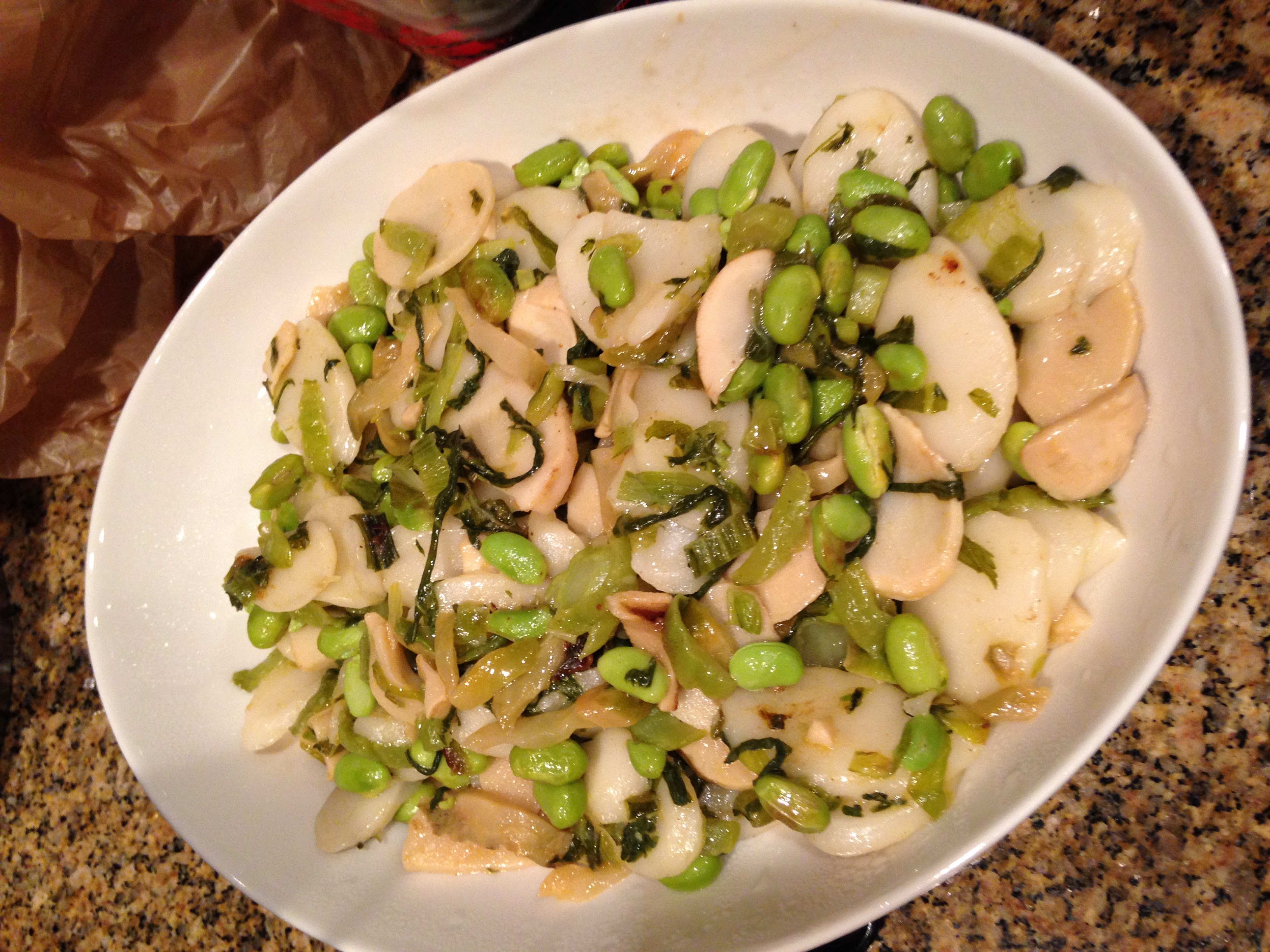 Hui Ye made Nian Gao, which is the traditional New Year’s Rice Cake. I had never had this before, as it’s not a tradition in my family 🙂 I may have to make it part of our traditions though, because I really liked it! The Nian Gao is like discs of chewy rice noodles. I enjoyed the stiff chewiness, and thought it went really well with the edamame, seaweed, and clams.