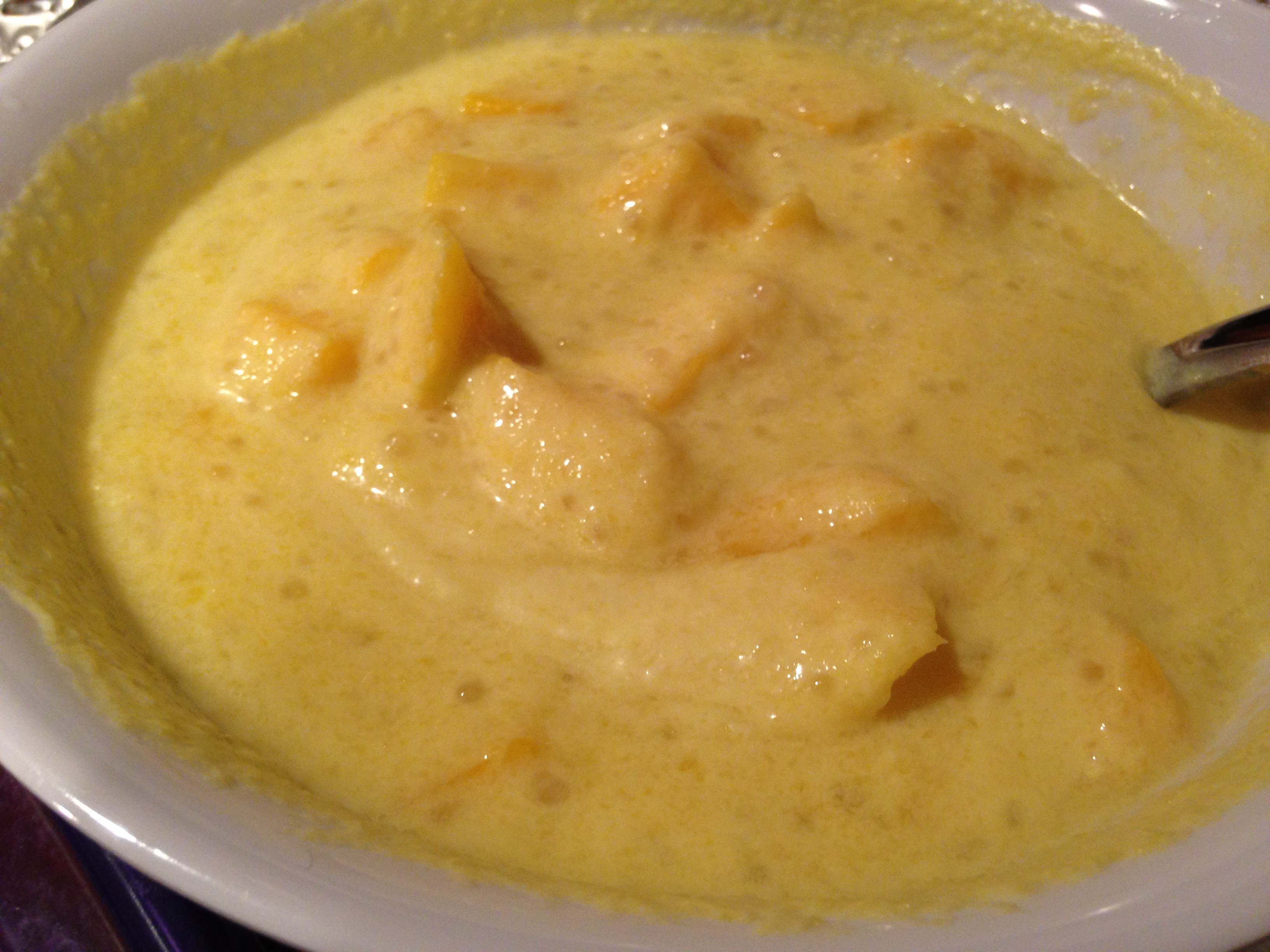 Robert and Halina also made Mango Soup with Tapioca Pearls. They went super off the reservation with this one, as it was from a completely different cookbook – Mastering the Art of Chinese Cooking. I forgive them only because this was so good I ate 3 bowls.