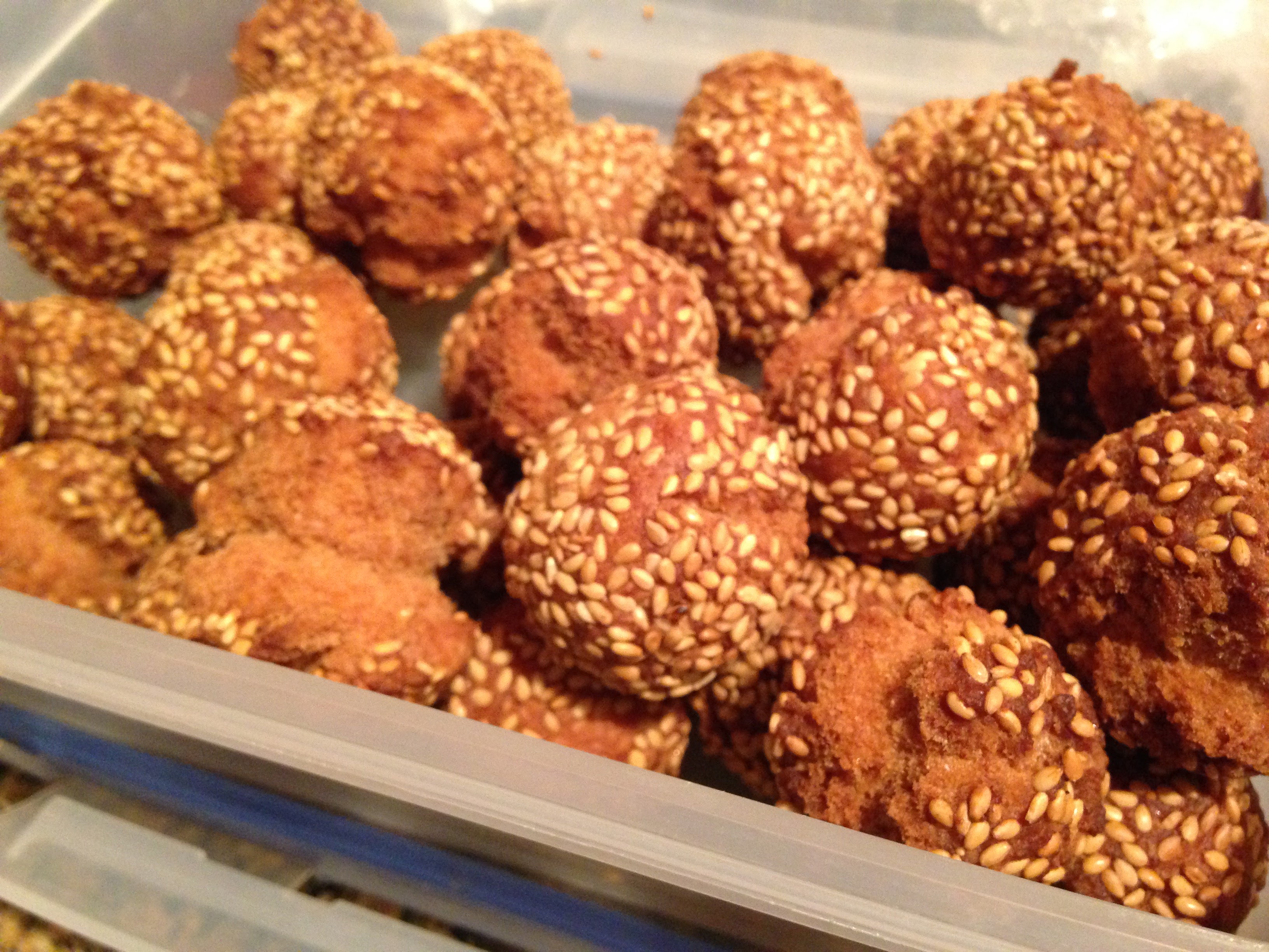 Sheana made Laughing Doughnut Holes. Not nearly as sweet as American donut holes, but really great sesame flavor. Perfect size for me to keep wandering by and popping another crunchy morsel in my mouth.