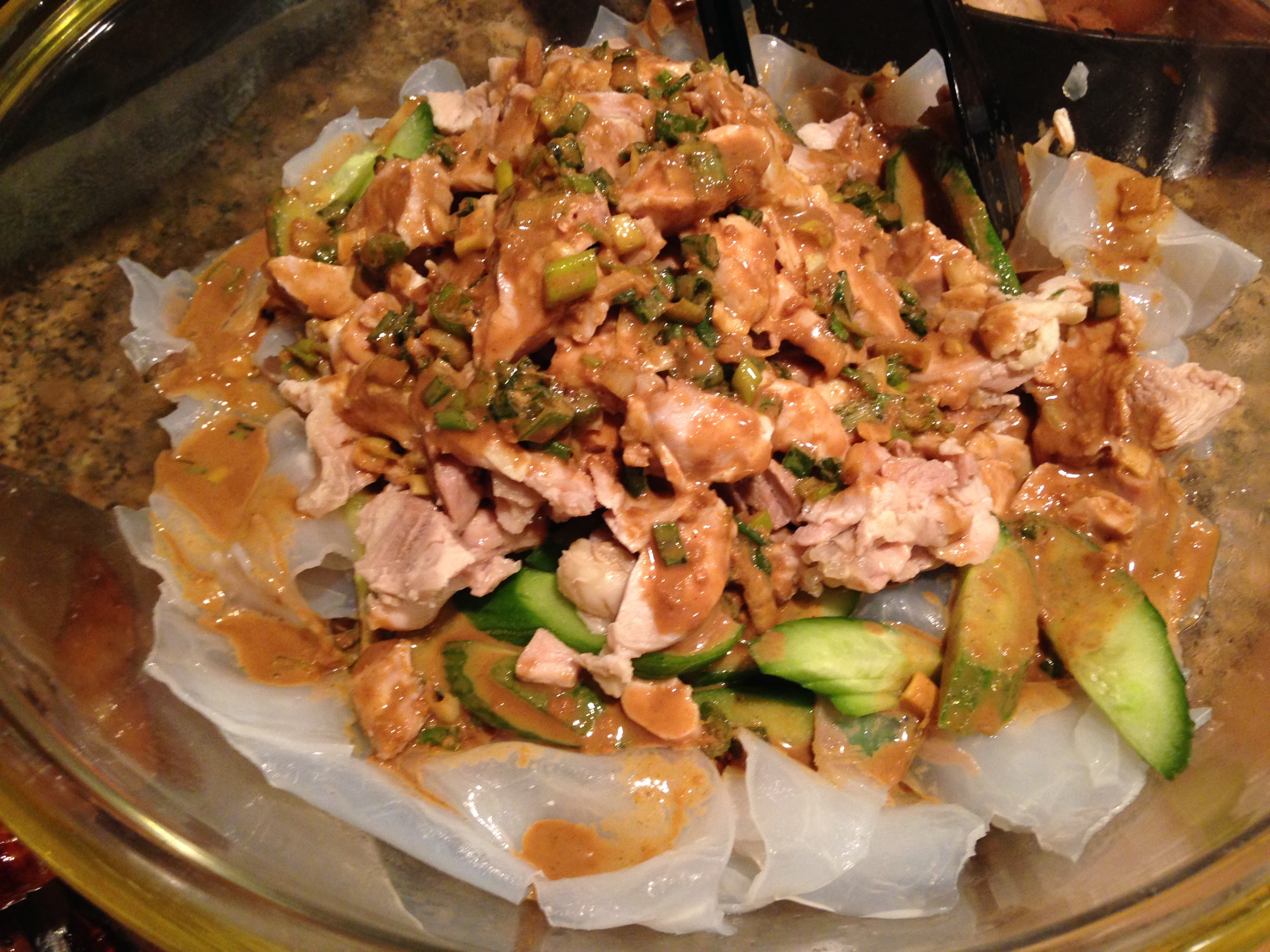 Cindy made the Manchurian Chicken Salad. It had a great fresh taste, with the cucumbers and ginger sesame dressing. The bed of what I thought were rice noodles turned out to be mung bean sheets. Turns out I like mung bean sheets!