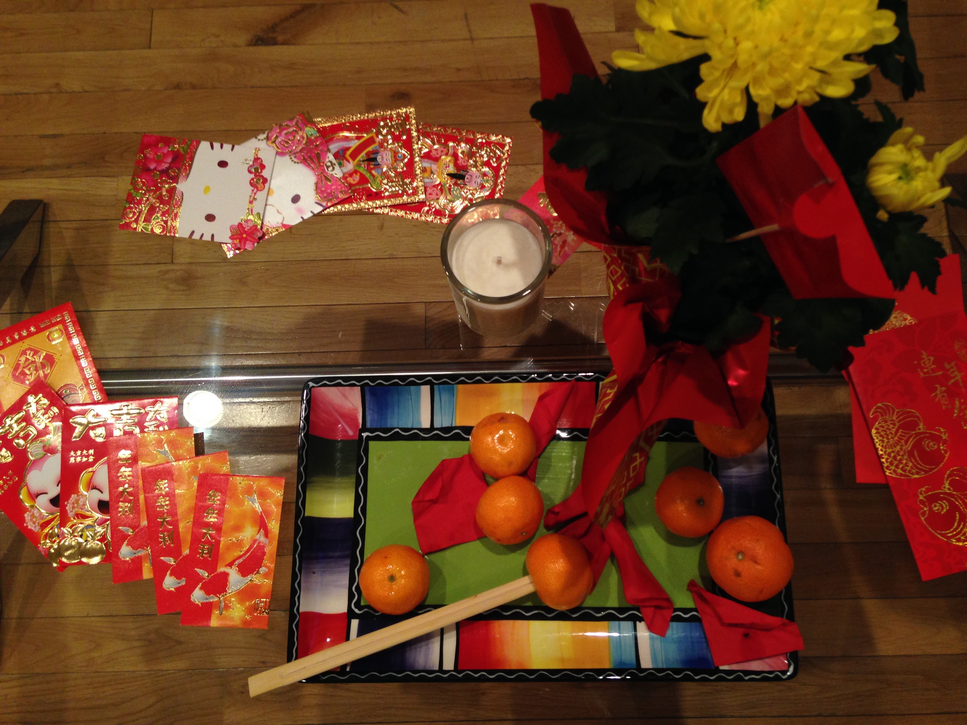 The Chinese New Year tradition also involves oranges for good luck in wealth, and red envelopes with money inside. Normally the married people have to give red envelopes to the single people, but we had red envelopes for everyone to take home. With 2 pennies inside, because pairs are also good luck! Since 2017 is the Year of the Rooster, we also sent everyone home with paper lantern and rooster party favors.