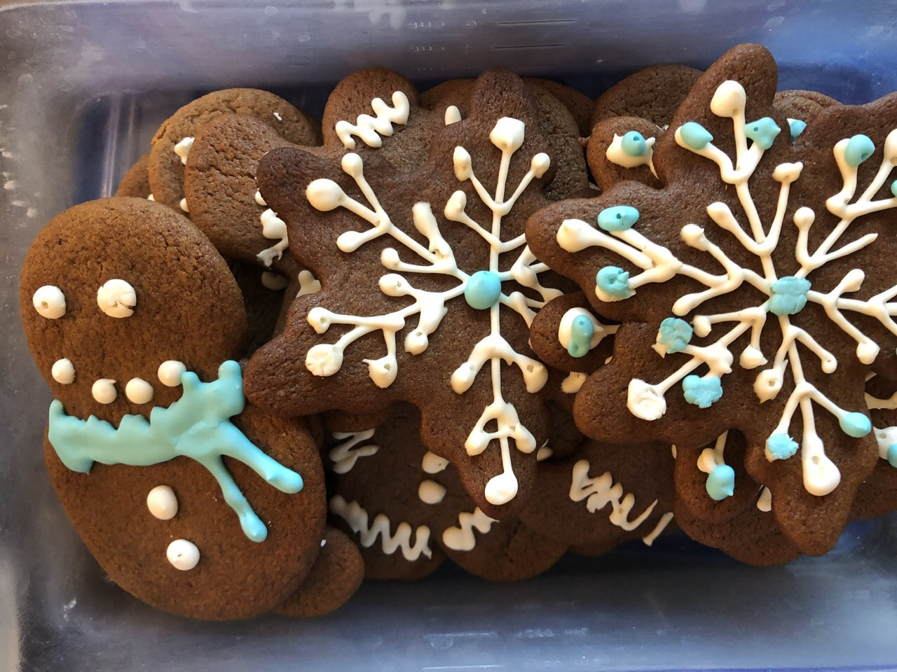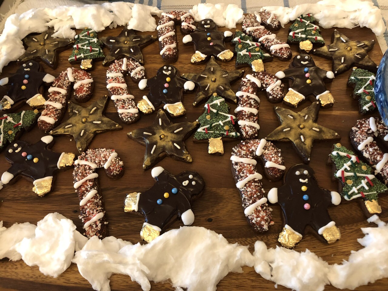 Heather made Chocolate Butter Cookies with Glaze. As always her presentation was on point, with beautifully decorated cookies plus an edible frame of apple cotton candy snow! The recipe included a bunch of glazes – she chose to do orange liqueur glaze for the stars and gingerbread men, and peppermint glaze for the trees and candy canes. Both were yummy.