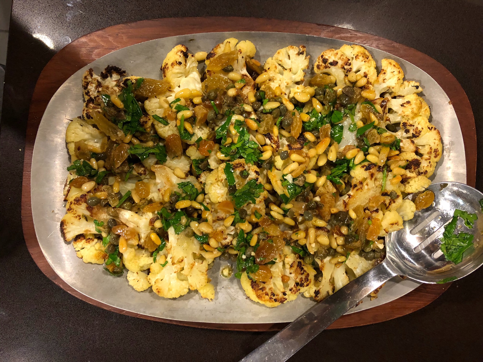 Brian made Roasted Cauliflower with Pine Nut, Raisin, and Caper Vinaigrette from The Food Lab. The sweet and tangy of the raisins and vinaigrette was a nice counterpoint to the nuttiness of the cauliflower and pine nuts.