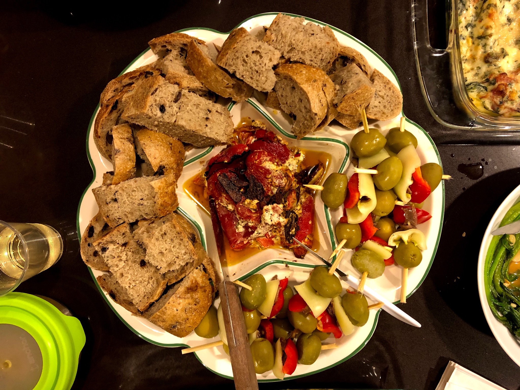 Catie made Gilda (Basque Skewers) and Goat Cheese-Stuffed Pequillo Peppers from The New Spanish Table. The Gilda are a super simple combination of olives, chiles, anchovies, and red peppers threaded onto a skewer, but it was a great combination. The stuffed peppers were really good eaten on a piece of the yummy olive bread Catie brought to accompany them.