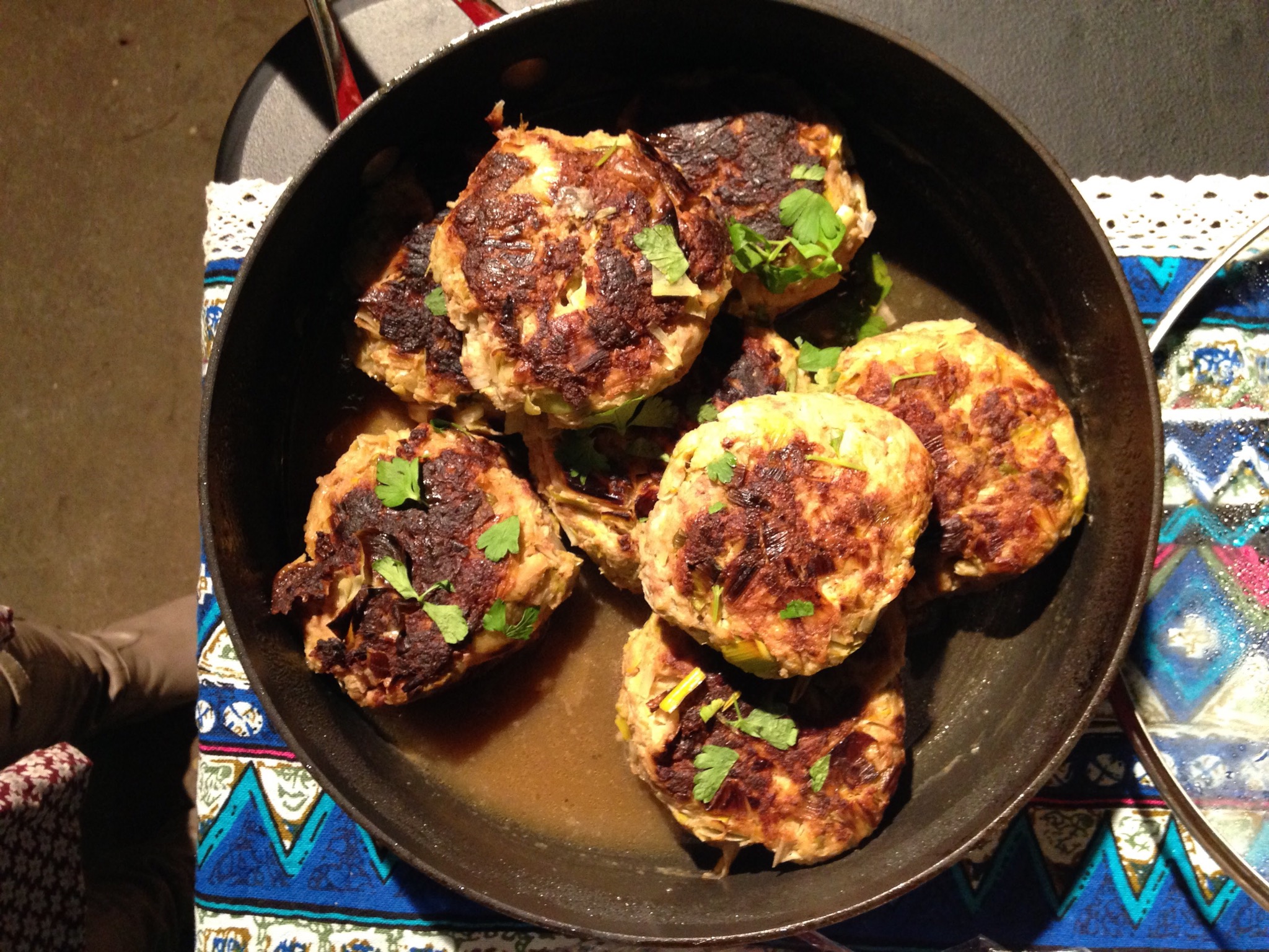 Jeff made Lemony Leek Meatballs. There’s a lot more leeks than meat in these, but it totally works. They had a lemony freshness that I really enjoyed, while still feeling meaty enough to be a main dish.