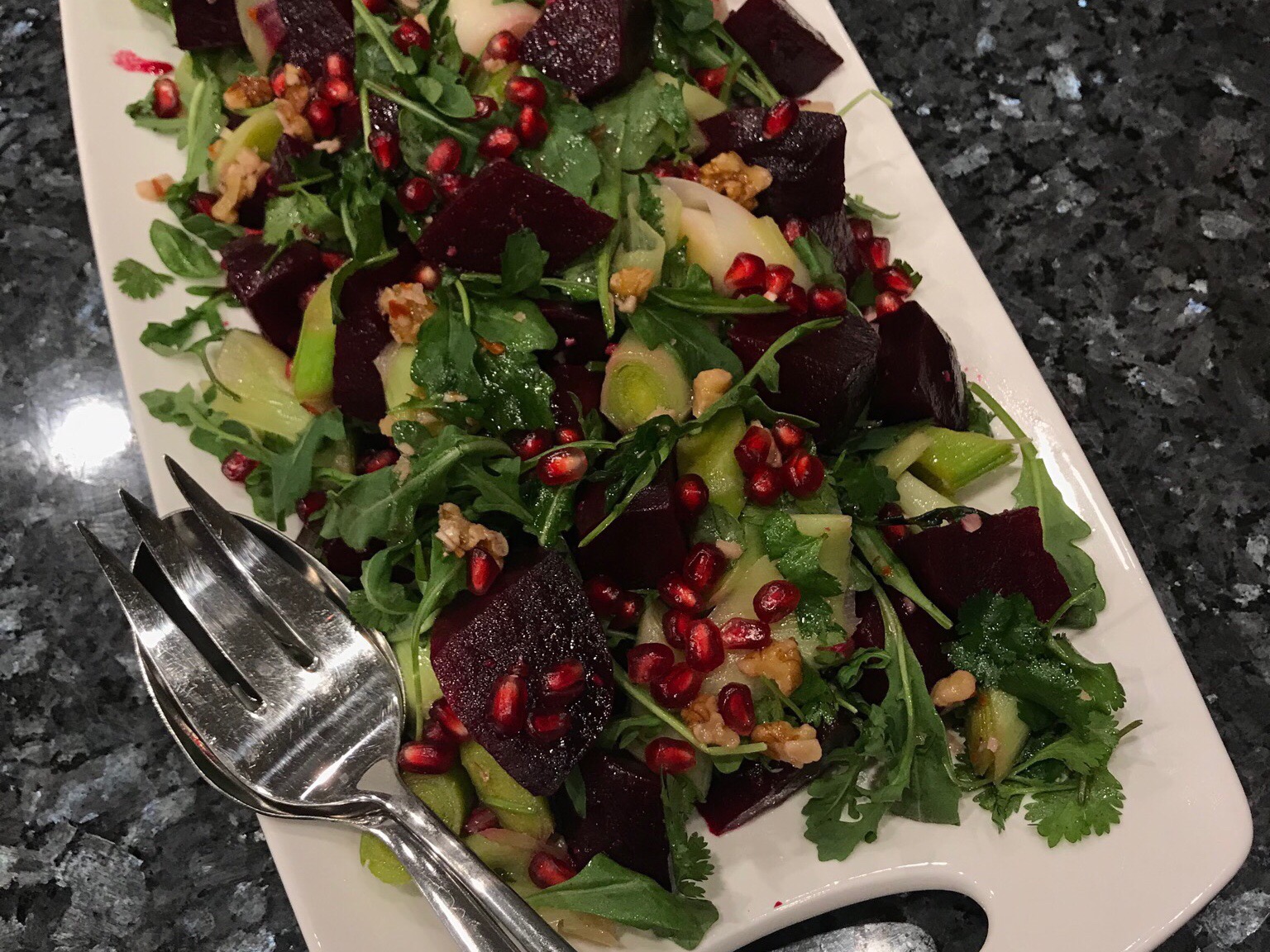 Cindy made Spicy Beet, Leek & Walnut Salad. The serving was perfect for a crowd and the way Cindy plated it made it even more inviting. The beets themselves were delicious, but there were many comments that the leeks were too large to eat (4” Segments!).