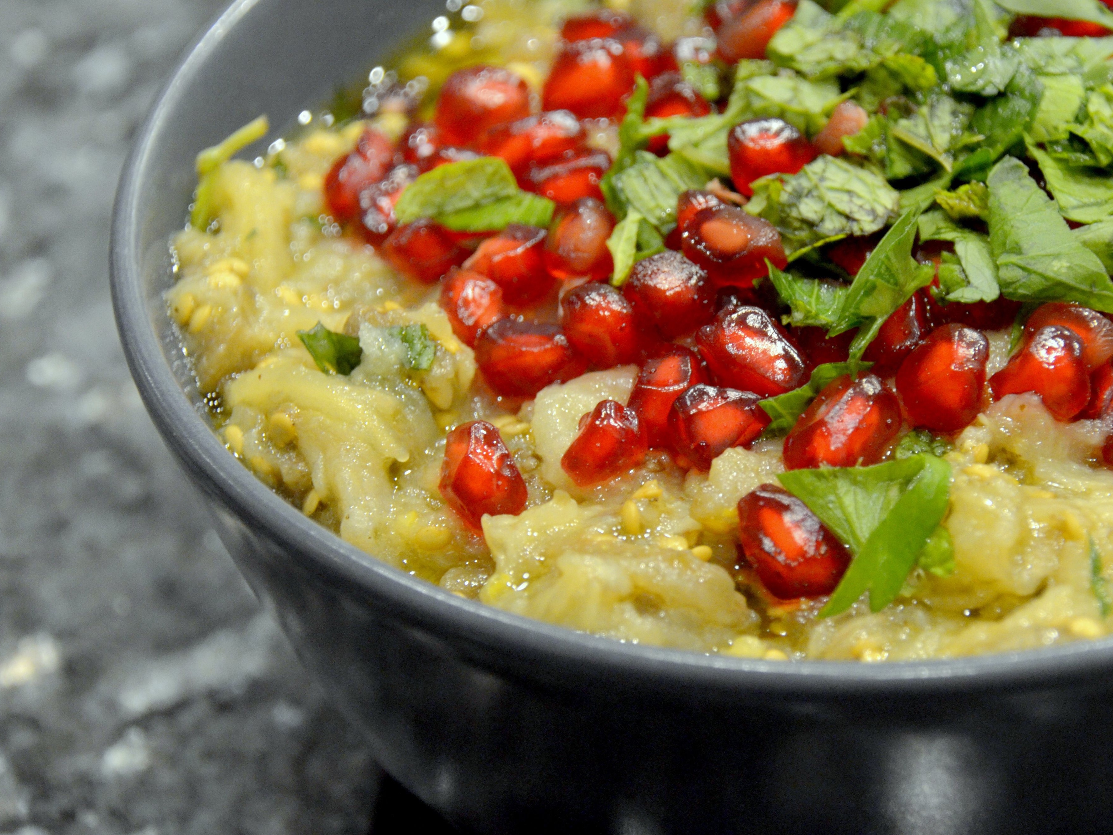 Brad made Burnt Eggplant with Garlic, Lemon & Pomegranate Seeds. The smokiness of the burnt eggplant came through really well, and was complemented nicely with the tart sweet pop of the pomegranate seeds.