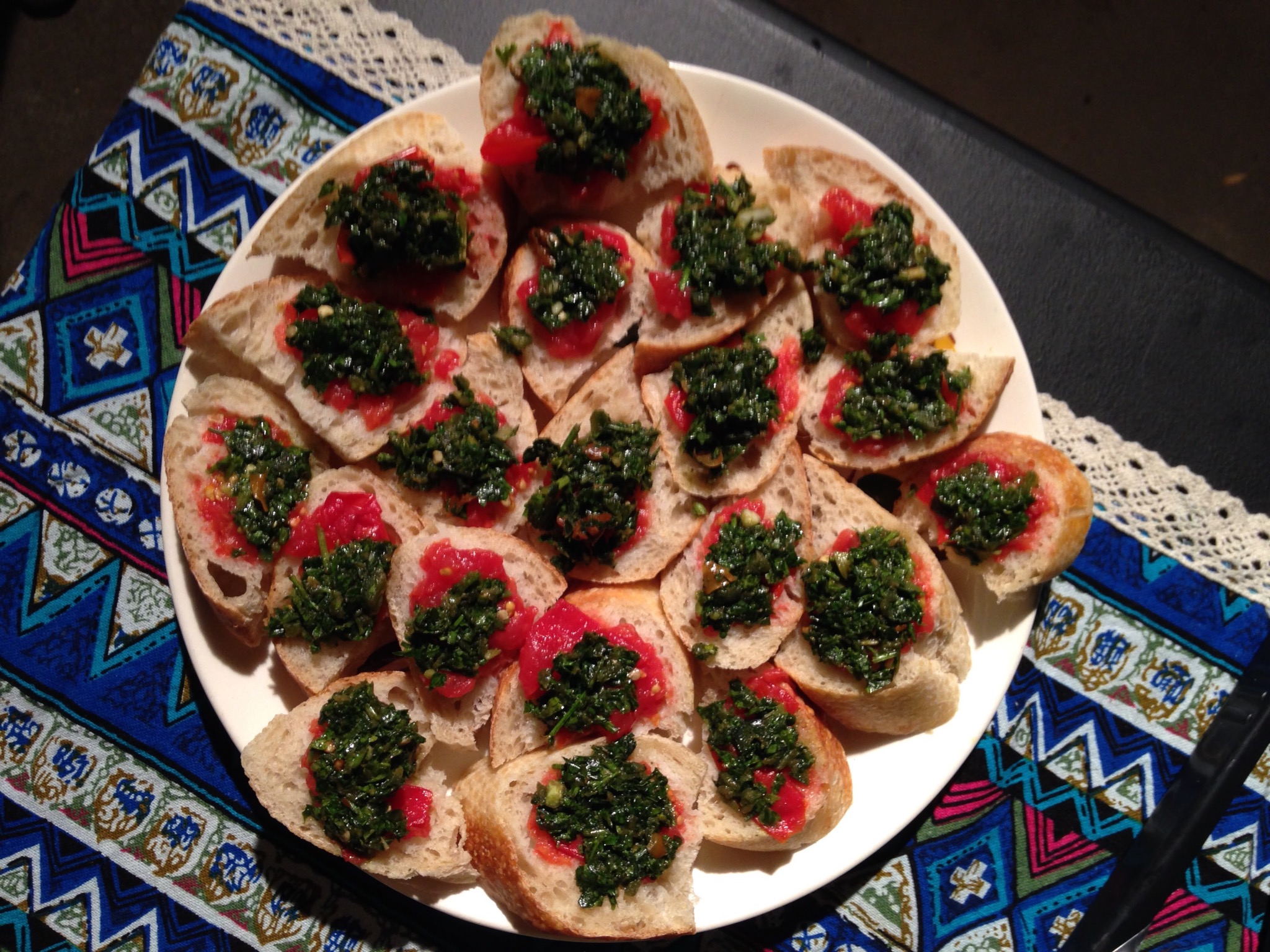 Erin made Zhoug, which she served with freshly grated tomatoes on bread. I really liked the fresh spiciness of this condiment. I can imagine using it to add kick to a lot of different dishes.