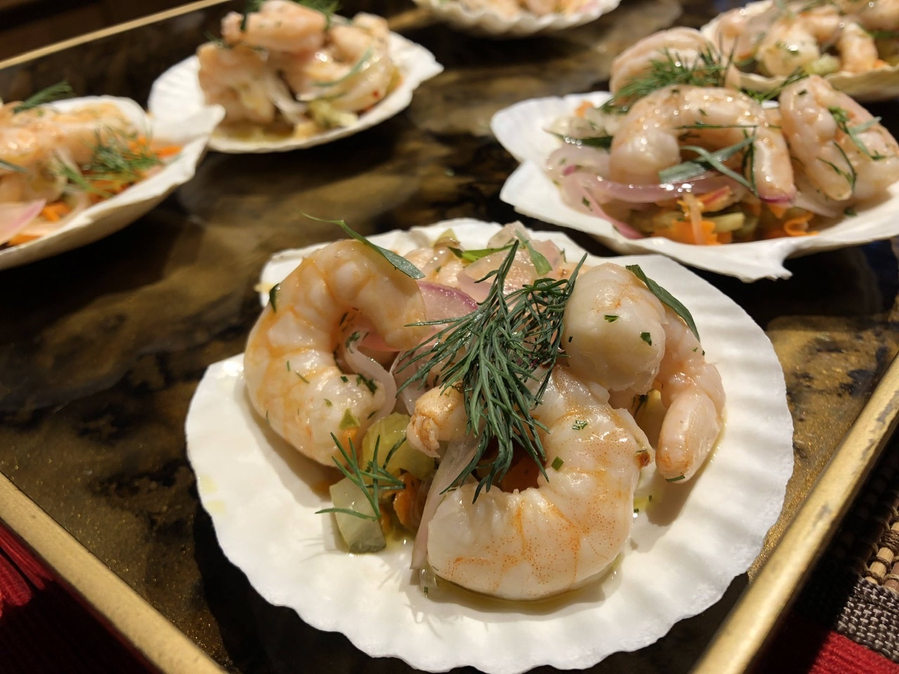 Brian made Savannah Pickled Shrimp. I love pickled things, and I love shrimp, so this dish was bound to be a winner for me. The shrimp was nicely tangy and the pickled vegetables added nice crunch. And A+ for presentation!