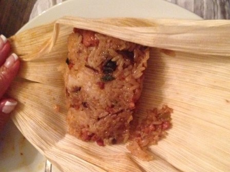 Sheana: A welcome starchy addition to the vast array of salty meats! I loved hearing about Katy’s quest for lotus leaves and her final substitution: corn husks. Totally worked!