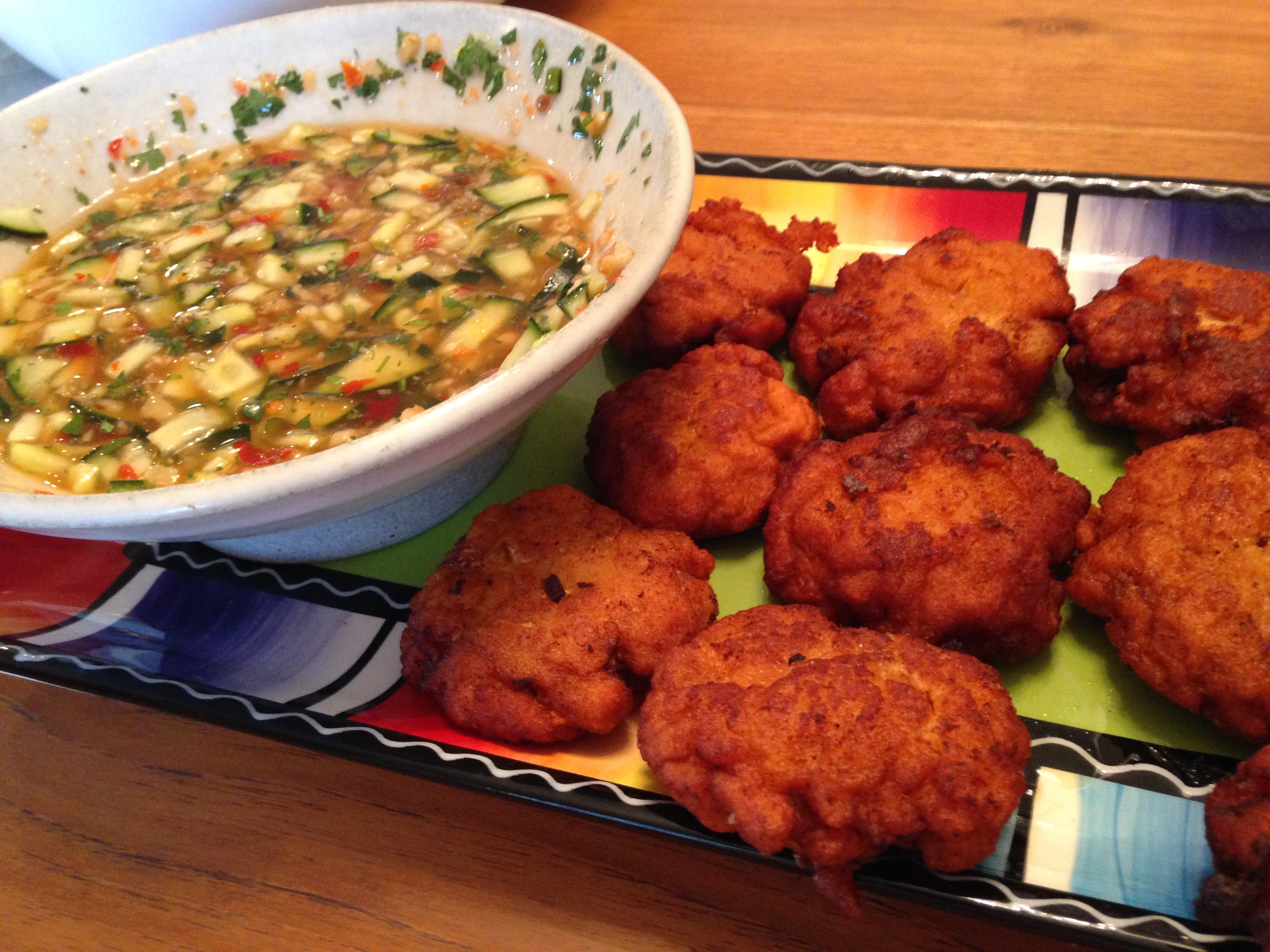 Alana: Colin made the Tod Mun Fish Cakes. The sweet chili cucumber sauce nicely complements these. This was another dish I think would have been really great when freshly fried. Though fair warning – Colin said they stunk up his house for days!