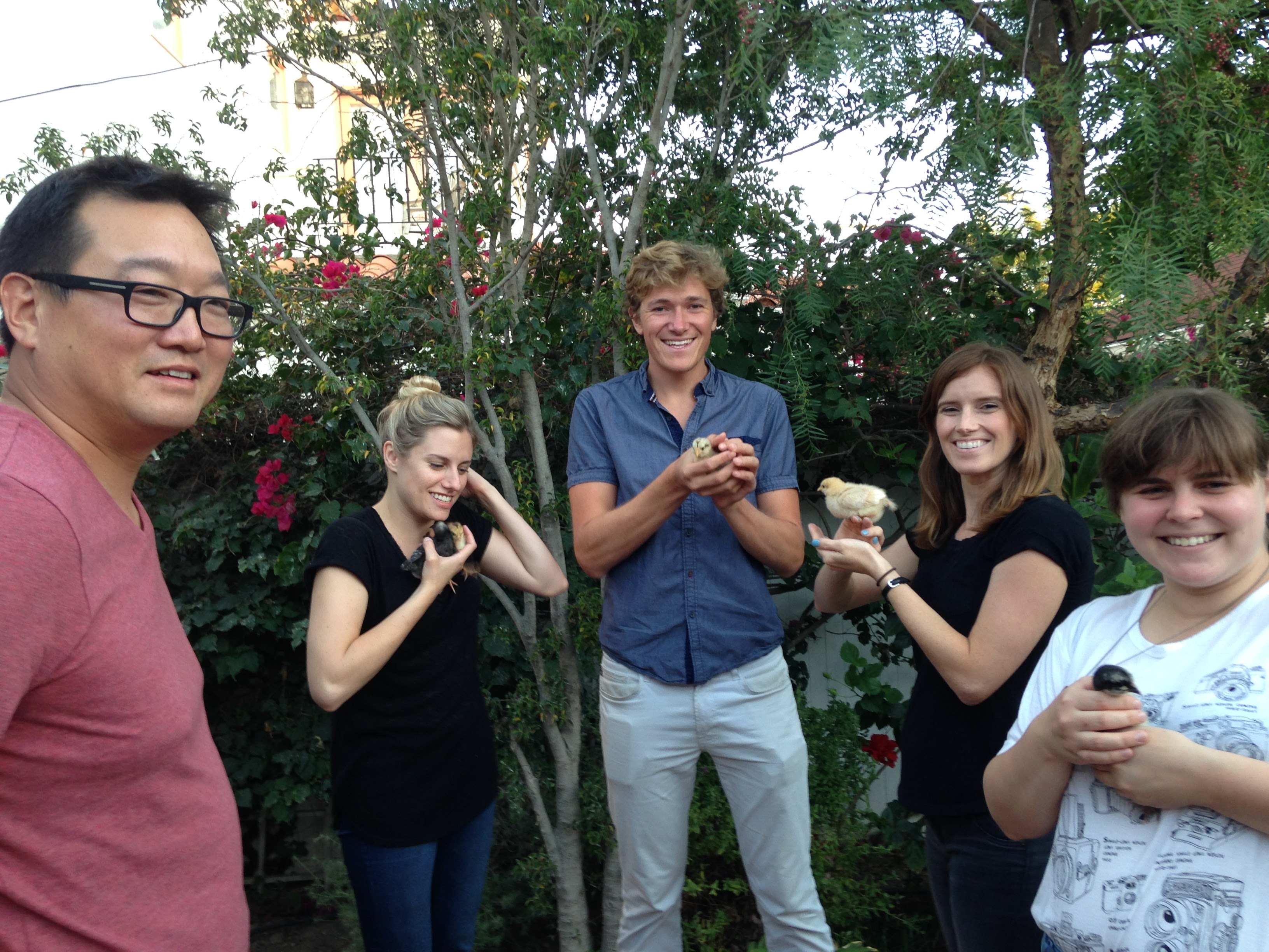 New type of food, and a new venue! Nelson invited us into his gorgeous new home. He has a fantastic indoor/outdoor patio area, and baby chickens. Yes that’s right – I said baby chickens. I mean, come on! Any party where you start out by holding an adorable little chirping fluffball is automatically great.