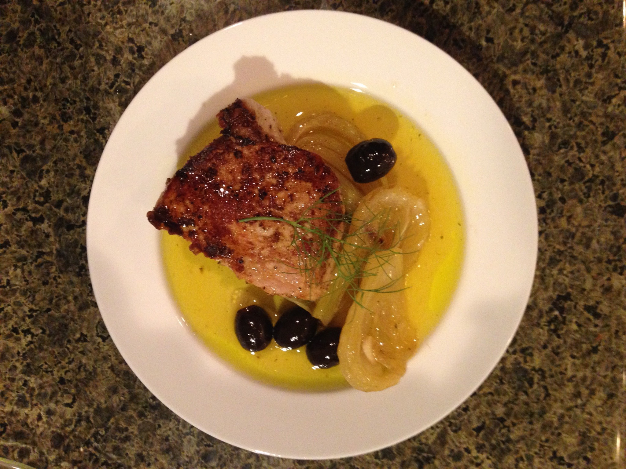 Next we moved on to the Pan-Roasted Pork Chops with Olives and Sambuca-Braised Fennel that Jeff made. This was absolutely fantastic and my favorite dish of the night. I don’t tend to be a huge fan of licorice flavor, but this was sweet and fragrant and meaty deliciousness. Jeff did warn that the fennel takes hours to braise, which made him super late to the party, but we were all so glad he made it!