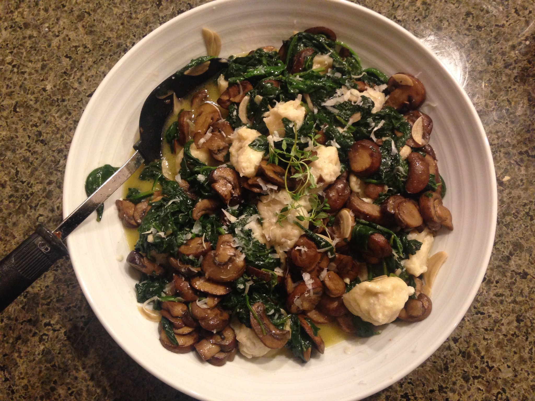 Our fourth course was Ricotta Gnudi with Chanterelles which Jennifer cooked at the party and served to us hot off the stove! I watched her put a whole stick of butter into the sauce and expected it to be very rich, but the mushrooms and spinach absorbed it pretty well. The gnudi were very light and fluffy, and the dish was delicious with a touch of finishing salt and pepper.