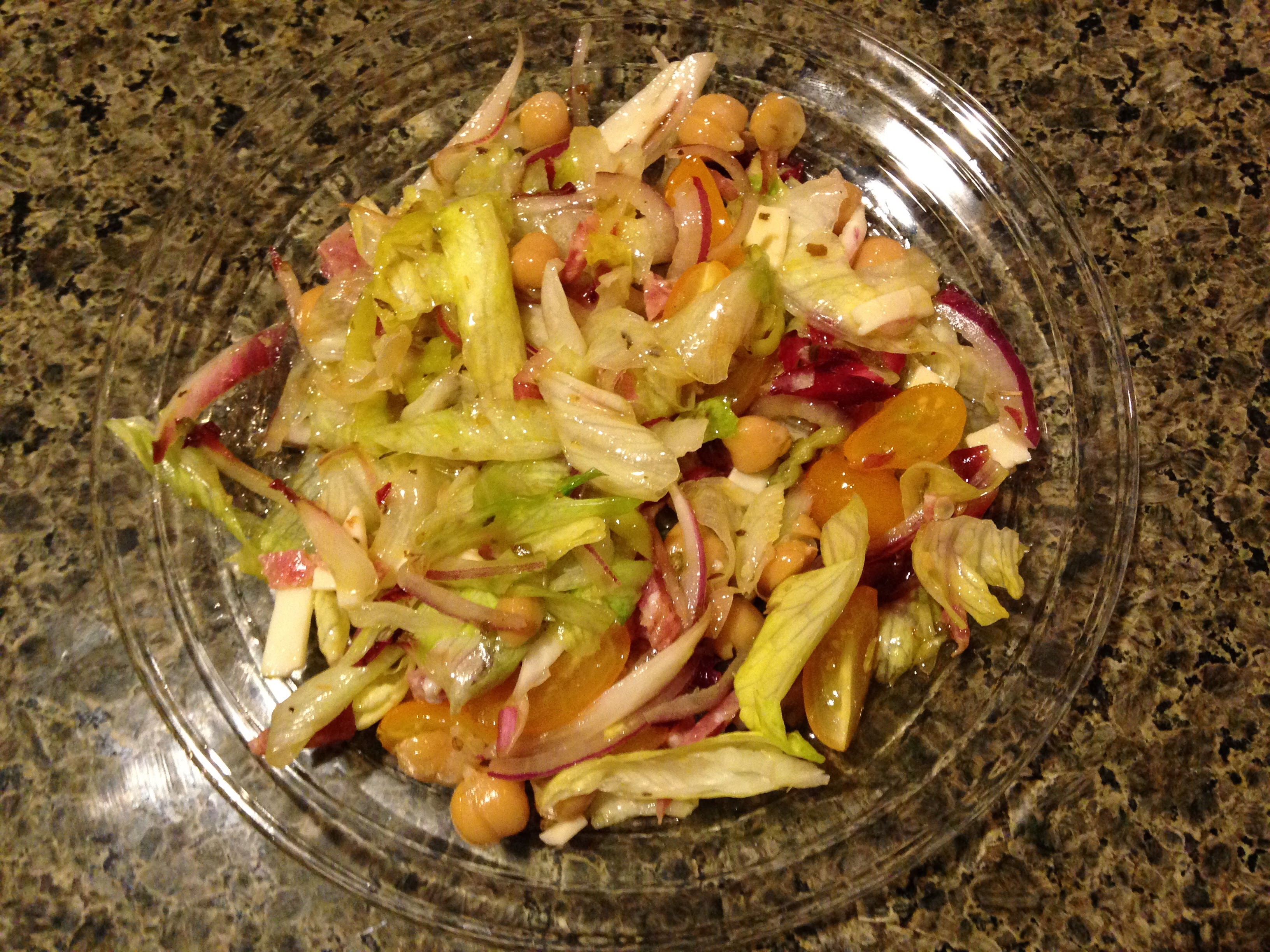 We started with Nancy’s Chopped Salad made by Brian. Salami, cheese, and chickpeas in a salad make it hearty enough that you could eat it as a meal all by itself. The oregano vinaigrette was wonderful, though Brian pointed out that the vinaigrette recipe makes 3x the amount that the chopped salad calls for, so he ended up with a lot of leftover dressing.