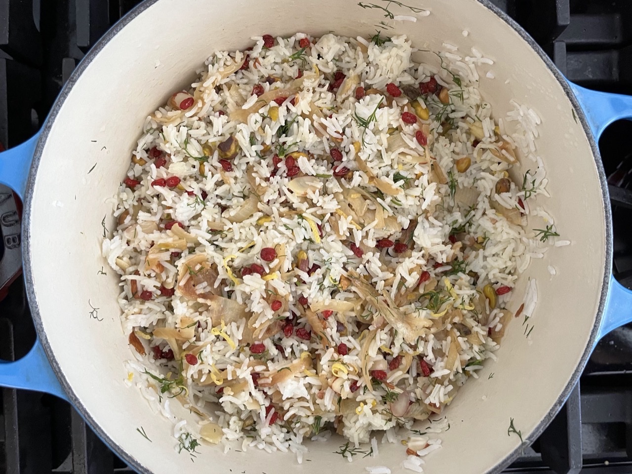 Laura made Jeweled Rice. The jewels included caramelized onions, barberries, pistachios, almonds, and dill. This rice was fragrant and fantastic all by itself, but also incredible as a base to soak up all the good sauce from both Rita’s beet and beef stew and Ximena’s harissa honey chicken. Laura did note that the onion didn’t take near as long to caramelize as the recipe suggested.