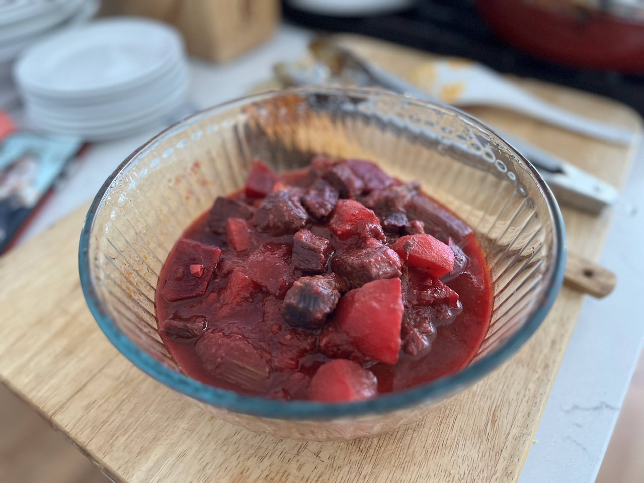 Rita made Root Vegetable and Medjool Date Stew. She used carrots, celery, and beets as her root vegetables, and there’s also beef in this stew. I’d never had a beet stew before, but I plan to again. Rita’s one complaint – the recipe said to cut all the root vegetables to the same size and add them all at the same time, but that left some undercooked and others too soft.